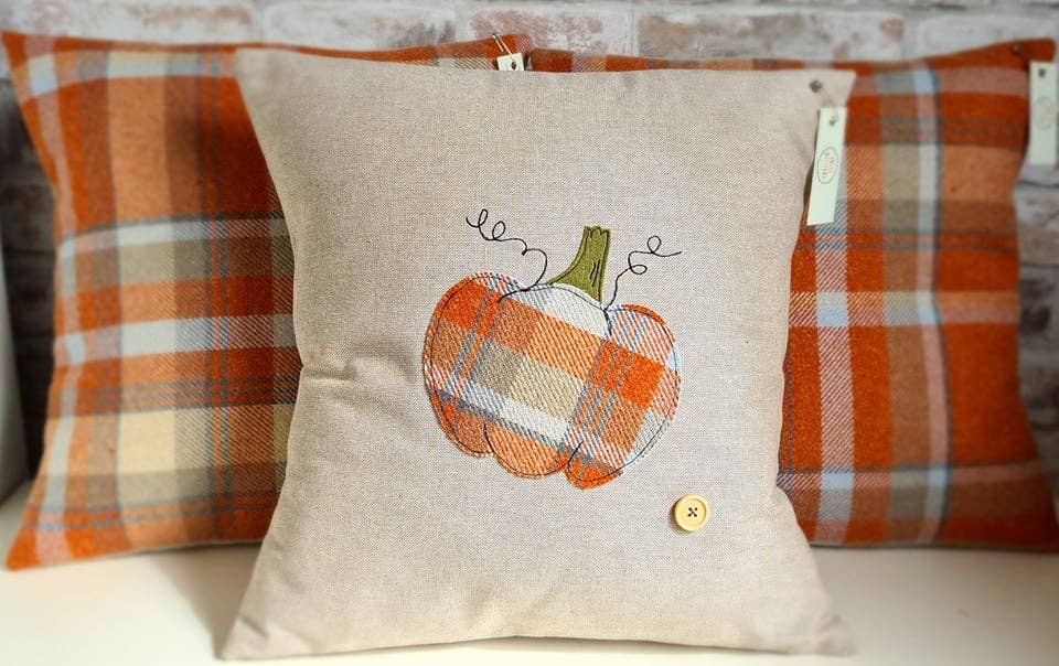 The latest addition to our autumn collection, this gorgeous cushion features a pumpkin that is hand drawn, hand cut and free motion embroidered using a new limited edition autumn colour tartan fabric. It has a moss green wool blend felt stalk set on a creamy tan linen look fabric and is finished with an envelope fold on the reverse. The plain square tartan cushions shown in the background are sold separately. Finished with a wooden button and filled with a premium hollow fibre cushion pad.