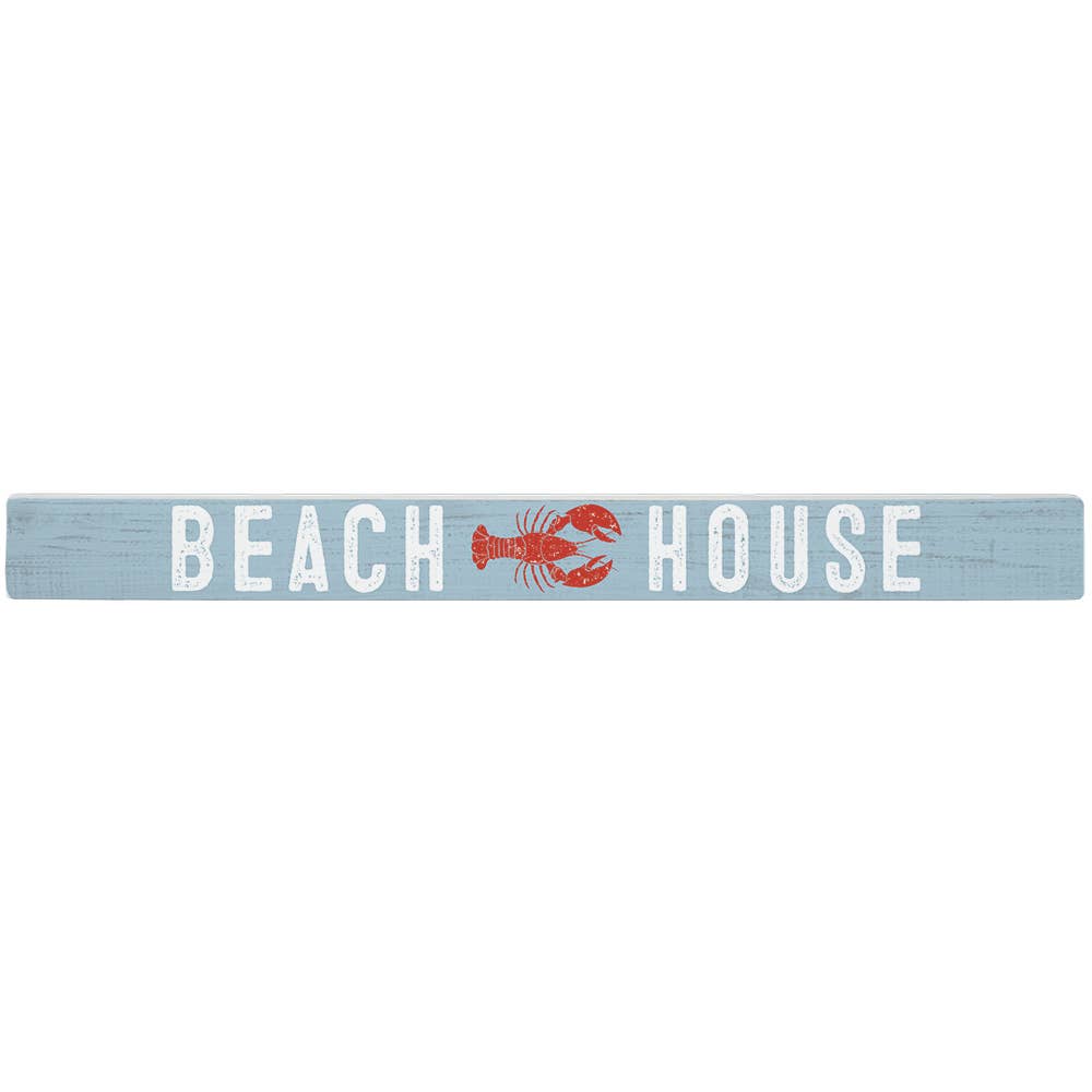 Solid wood sign painted in a pretty coastal blue with the message 'Beach House' featuring a lobster detail in the centre. Sit on your favourite shelf for easy display.