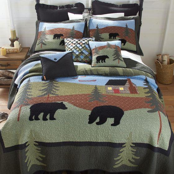 Quilted pillowcase sham in shades of green, blue and brown with two bears and trees. The sham is finished with an intricate stippling quilted pattern. Coordinating quilt available to order separately.