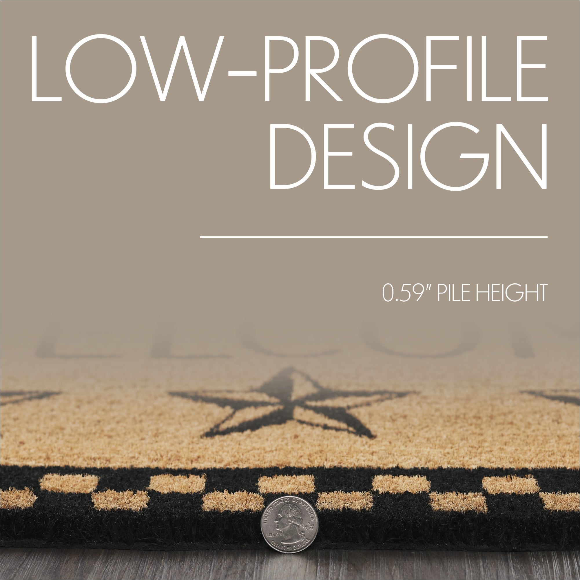 A beautifully designed doormat featuring a bold "Welcome" message with barn star accents, all set against a natural tan background. The black checkered border adds a traditional farmhouse touch, making it an ideal addition to any entryway with a rustic or primitive decor style.