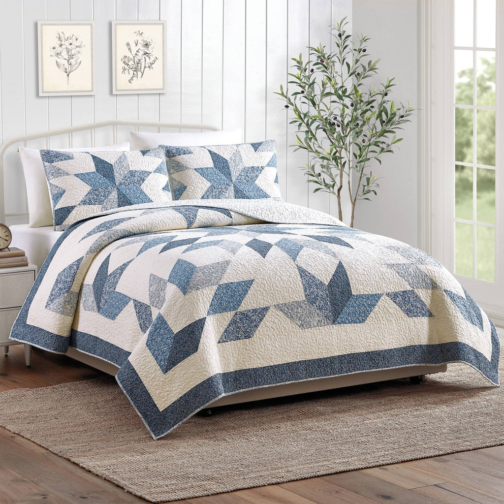 Bring timeless charm to your bedroom with this stunning patchwork quilt set. Featuring a beautifully crafted cotton face and cotton fill, this lightweight quilt set is designed for year-round use. The intricate patchwork design showcases a striking star pattern in soothing blue tones, adding a touch of elegance to any decor. Backed with soft microfiber for extra comfort, this quilt is as cosy as it is stylish. It is also machine washable for easy care and low maintenance.
