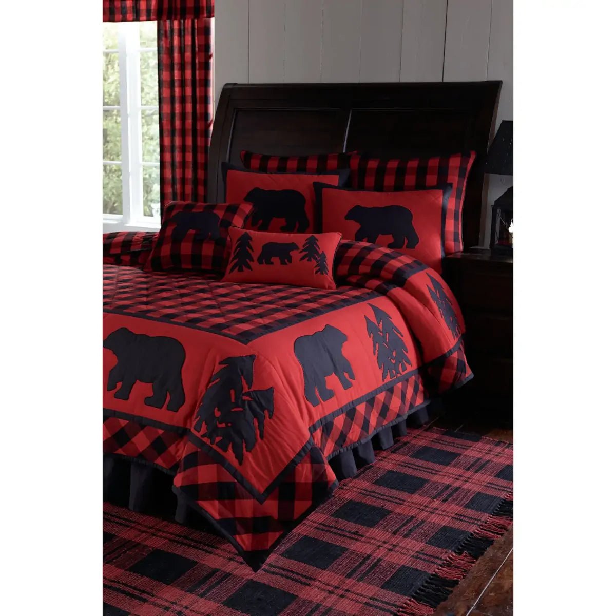 American Lodge style bedspread with a classic bold red and black buffalo check design accented with applique black bears and tree silhouettes. Shams and cushions sold separately.