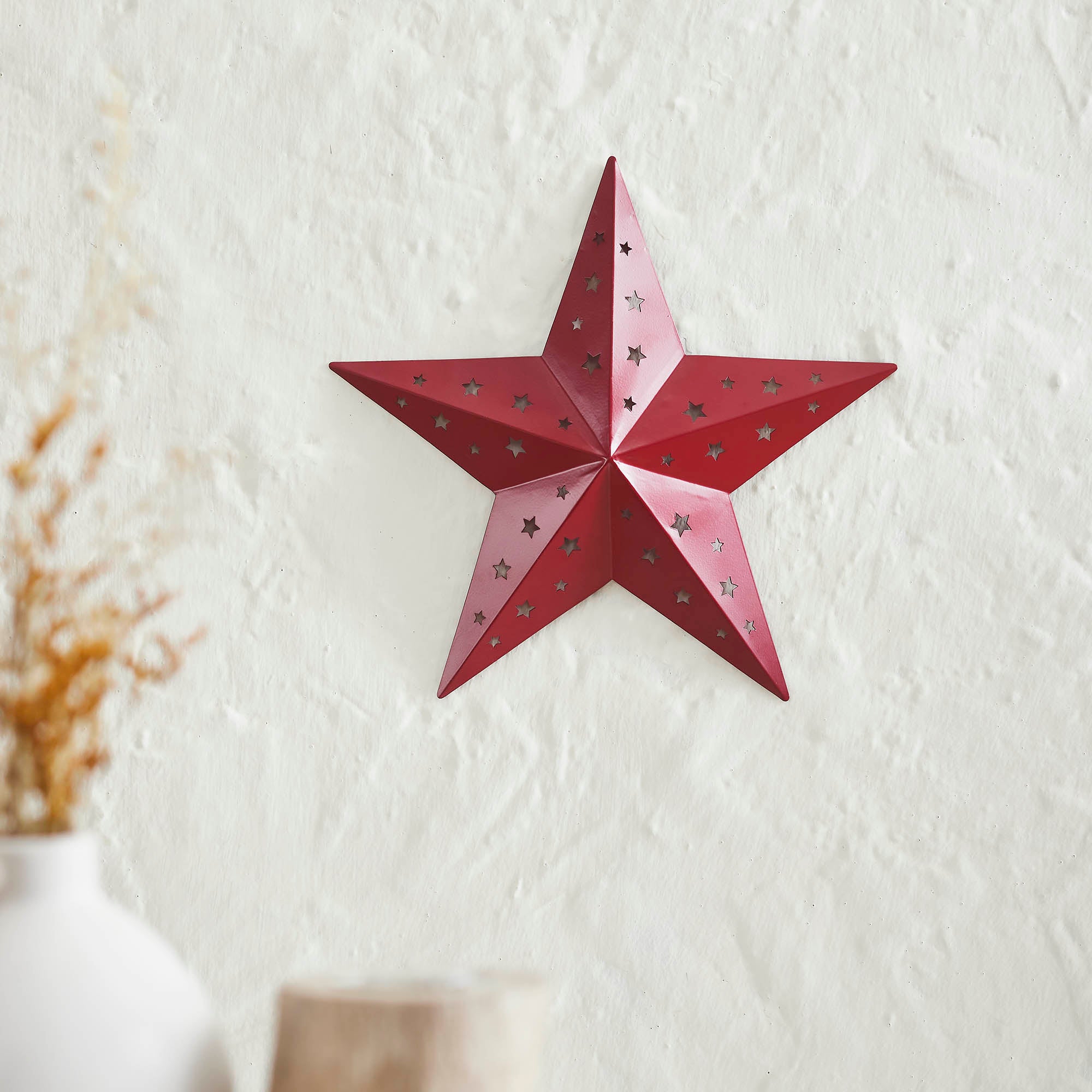 A beautiful 5-point star in a rich burgundy finish that is uniquely designed with multi-sized scattered stars punched through the metal, allowing light to shine through and create a captivating display. It's a perfect accent piece for anyone who loves farmhouse decor. Versatile and stylish, this wall art can brighten up various spaces, including the living room, bedroom, bathroom, or kitchen.