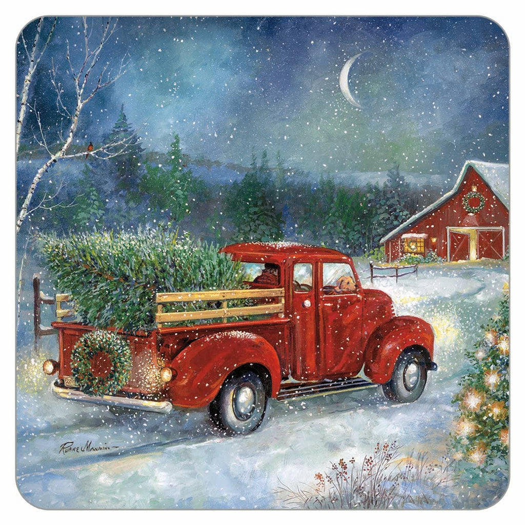A heat and water resistant coaster that is backed with cork to withstand regular use. Artwork features a vintage red pickup truck carrying a tree in the snow next to a barn. Makes a great stocking filler.