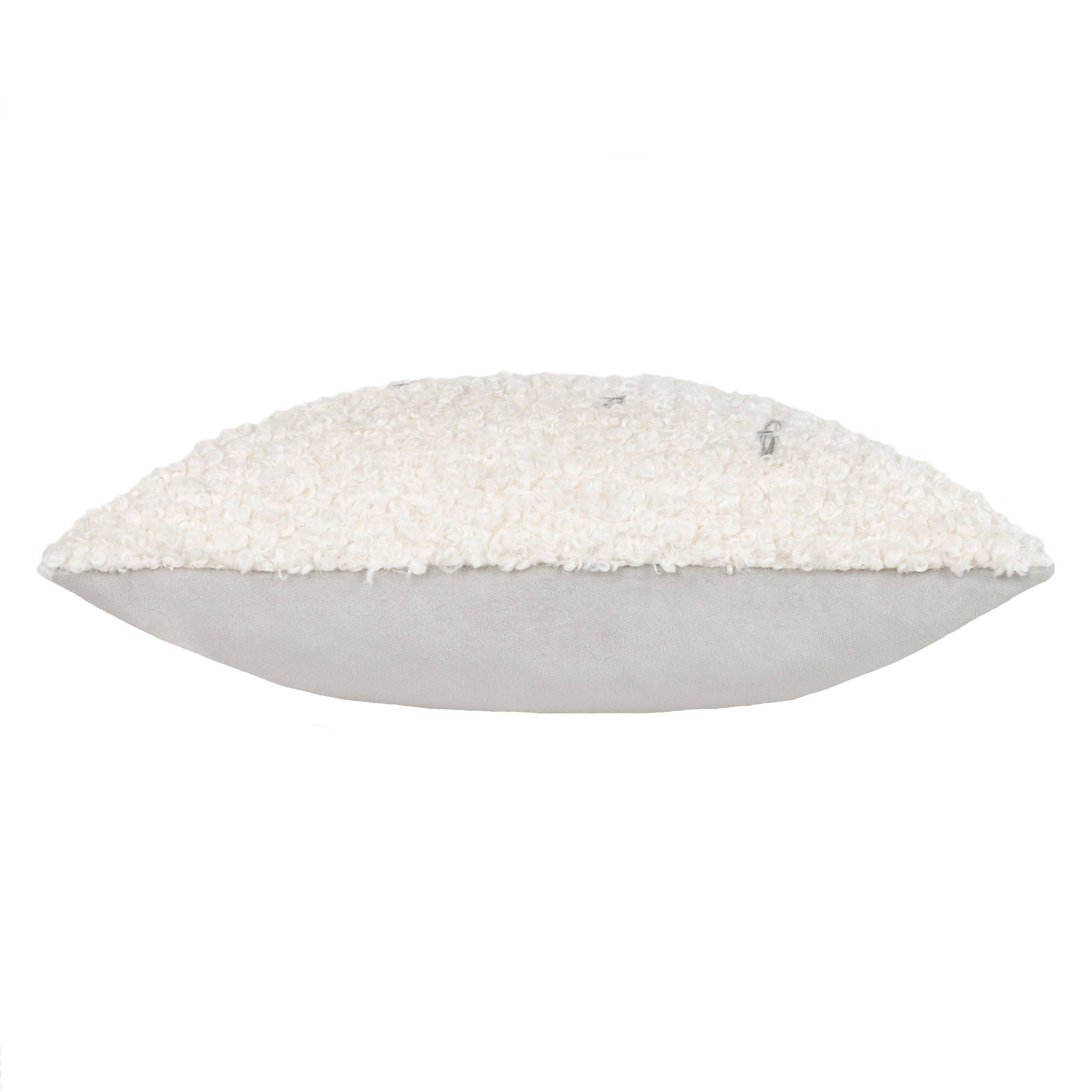 A super soft wintry cushion with a detailed embroidered design of people making snow angels in the cosy snow-like boucle fleece fabric. There are sparkling silver lyrics from Let it Snow, and it is finished with soft velvet on the back.