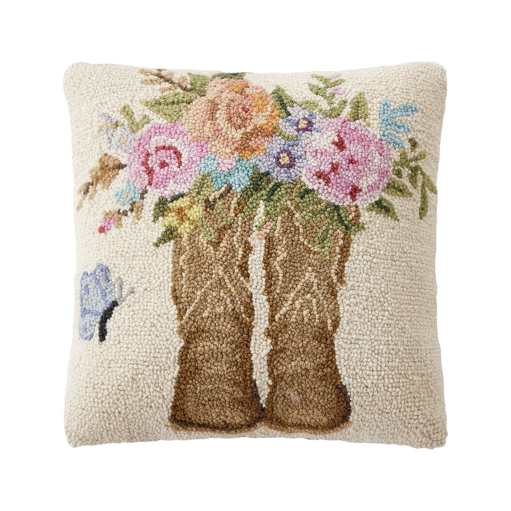 A beautiful hooked pillow featuring artwork by American artist Susan Winget featuring a pair of cowboy boots filled with roses.