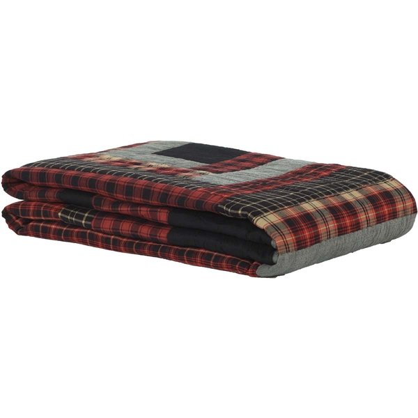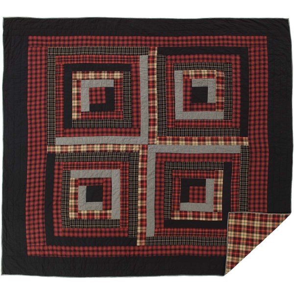 Quilted pillowcase with a log cabin patchwork of red, black, grey and tan check fabrics....
