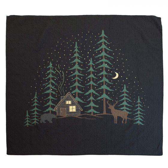 This eye-catching, 3-piece quilted bedding collection features a cabin under the stars, surrounded by pine trees and forest animals. Colours include forest green, pale gold, black, burnt umber and cocoa brown. The brushed polyester fabric is easy care and super soft right out of the package.