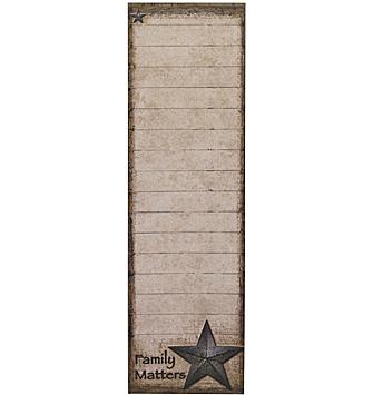 Magnetic list pad with a black barn star and the message 'Family Matters'. Perfect for shopping lists.