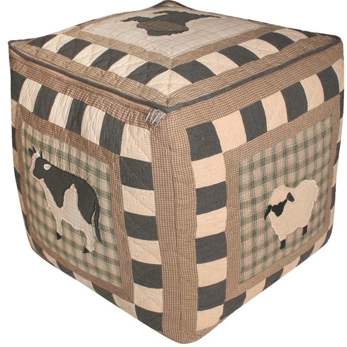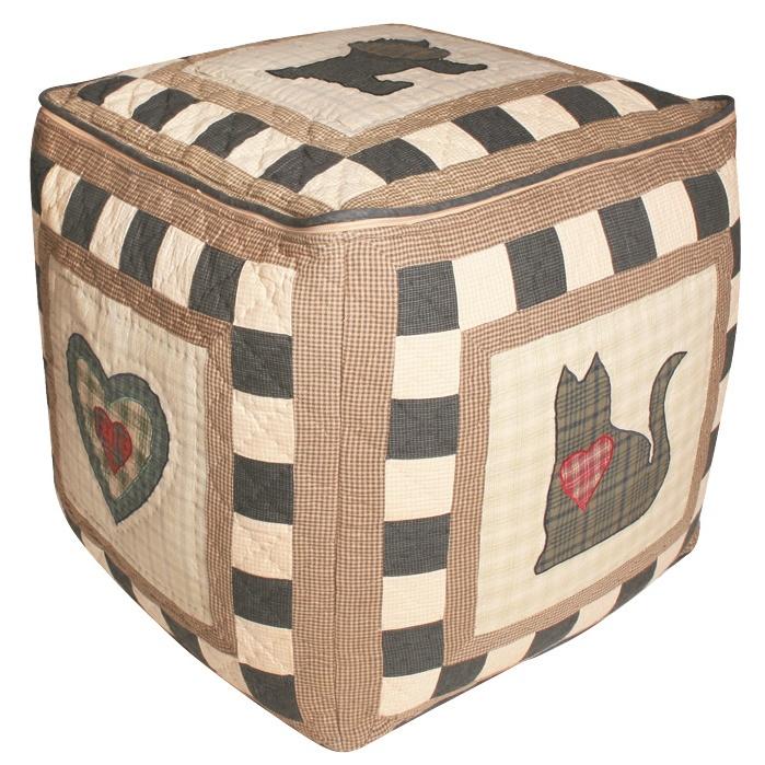 Our most popular quilt now comes in a matching pouffe. Can be used for lounging, as a footstool or in children's rooms. Different animals and a heart design on the sides in earthy colours of tans, beige, navy, brick red, cream, green and grey.