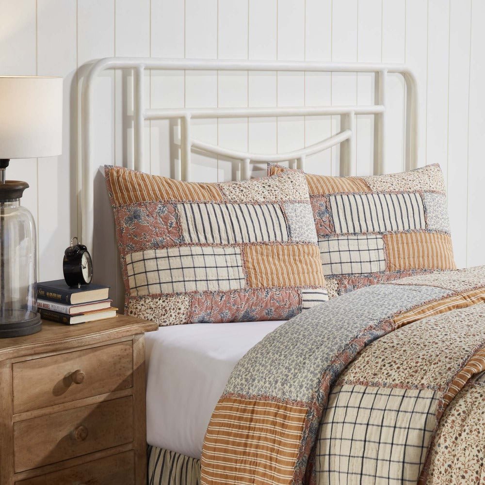 Add a touch of vintage American farmhouse style to your bedroom with our Kaila patchwork collection. The Kaila standard sham mirrors the Kaila quilt perfectly, showcasing delicate floral prints, classic stripes, and windowpane patterns in navy, gold, and dusty rose. Beautifully finished with a handcrafted reverse seam throughout the patchwork for added texture and vintage charm. Reverses to a matching floral pattern with tie closures to give your bedding a unique twist when styling your bed. Quilt sold separately.