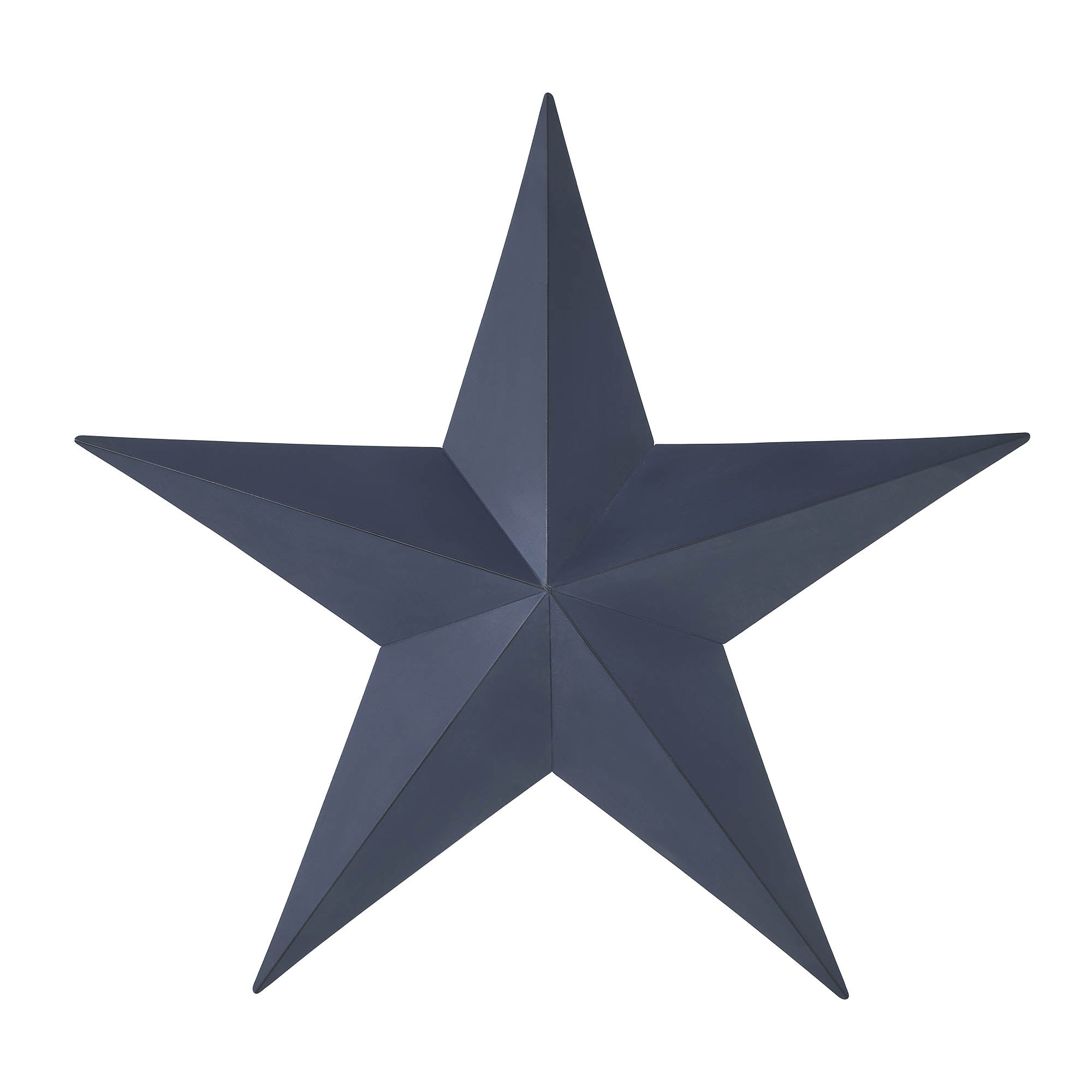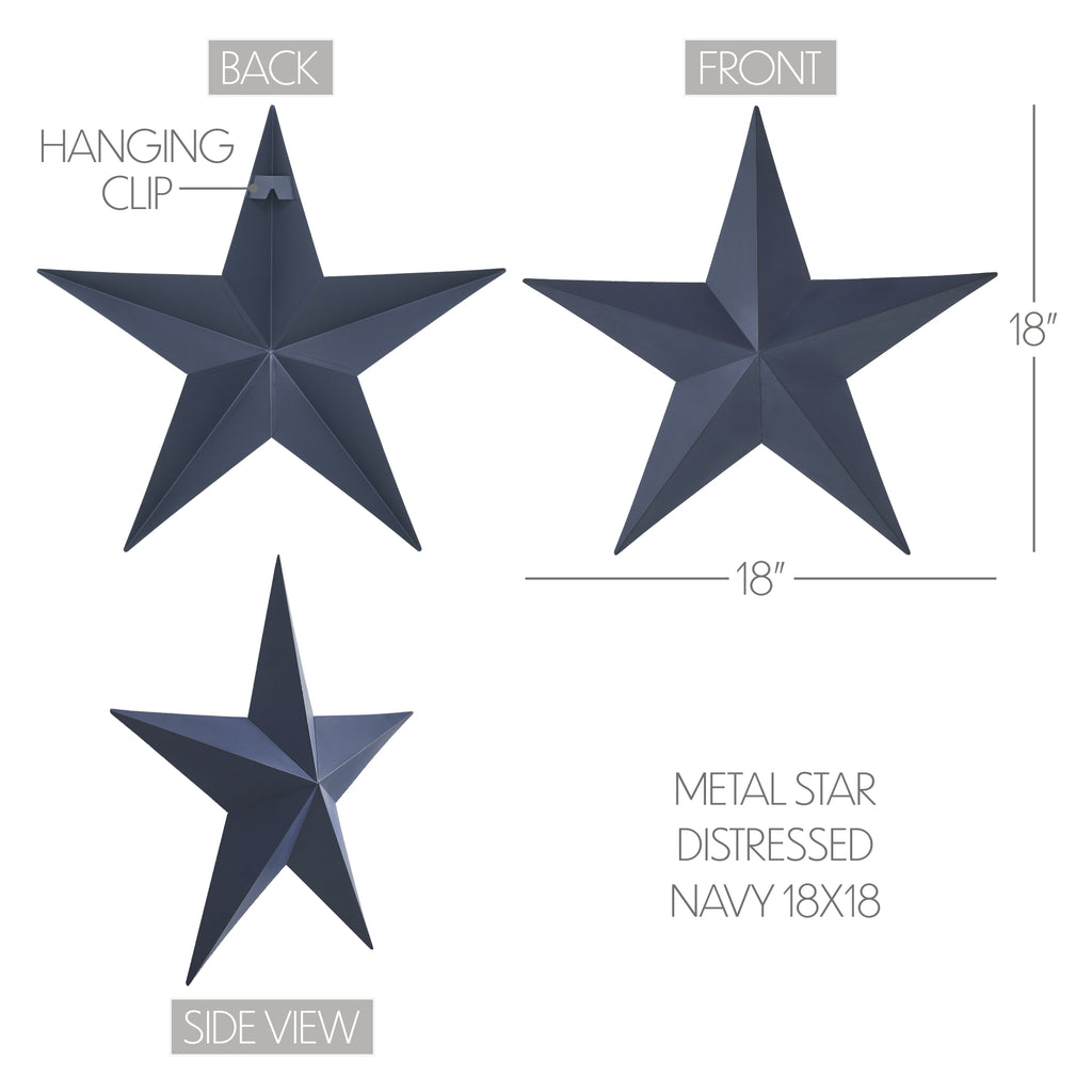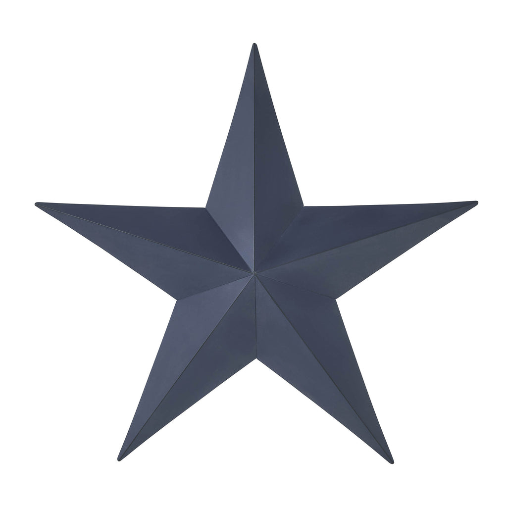 This large decorative wall hanging features a faceted five-point star design in a rich navy finish accented with black distressing along the ridges for a beautifully weathered and vintage-inspired look. A convenient hanging clip on the back ensures easy and secure display, making it a perfect addition to year-round farmhouse-style decor.