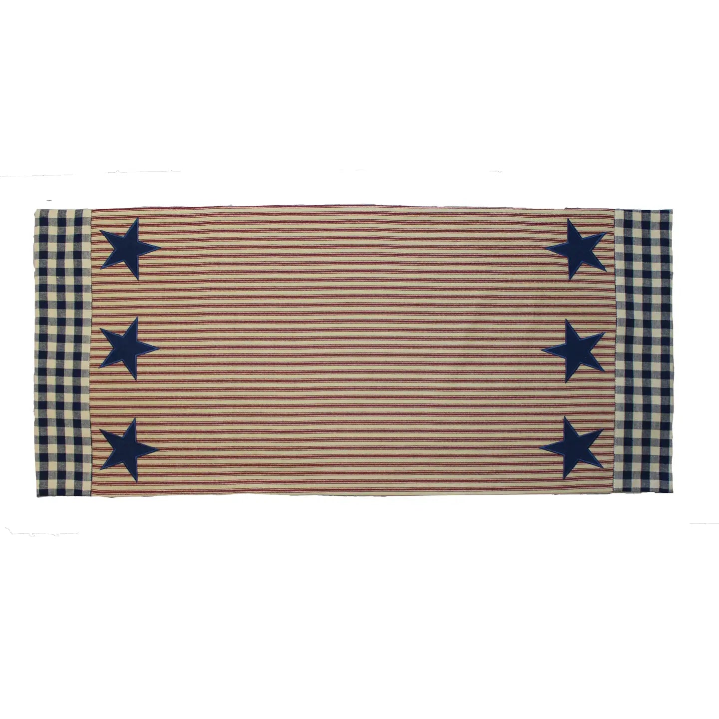 A primitive American country style table runner featuring navy star appliqués set on a barn red ticking stripe background. Finished with a navy check border. Makes a great 4th of July or Thanksgiving gift.
