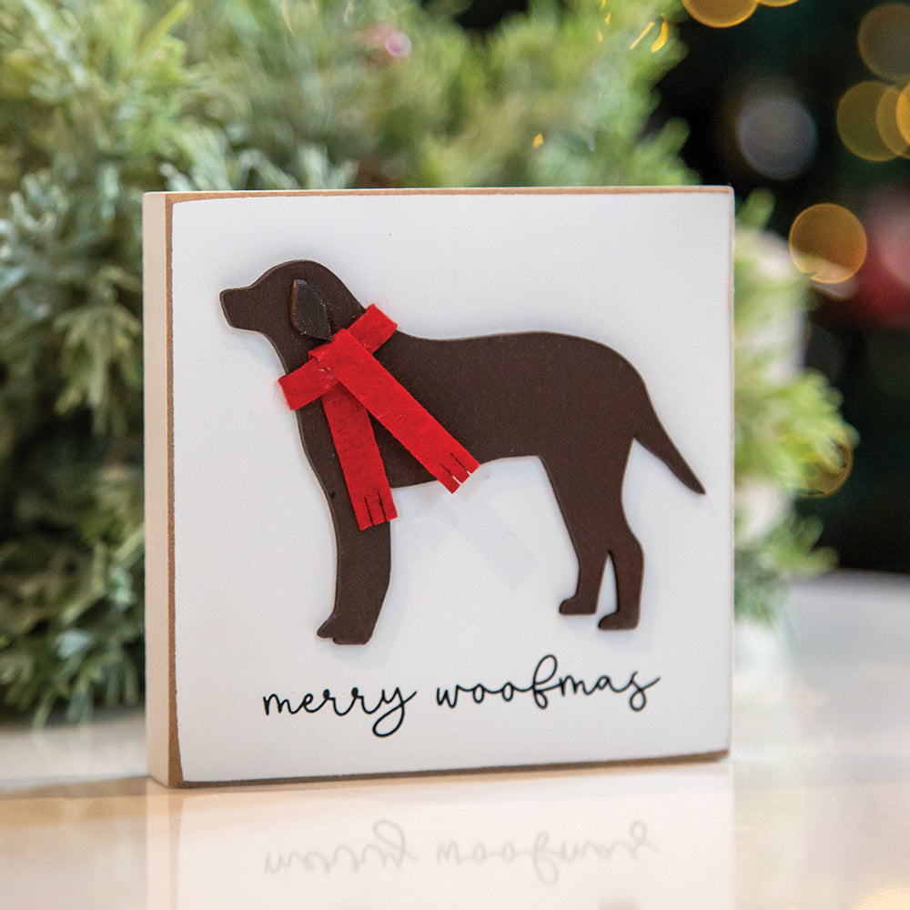 The charming Merry Woofmas Dog Block is a great way to wish visitors a Merry Woofmas! Reading ‘merry woofmas’ in black script, this white block sign has distressed edges and depicts a dark brown cutout out of Labrador with a bright red felt scarf.