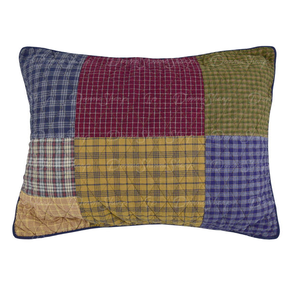 Quilted patchwork pillowcase sham with vintage stripes, micro checks, and red chambray coordinated in a simple...