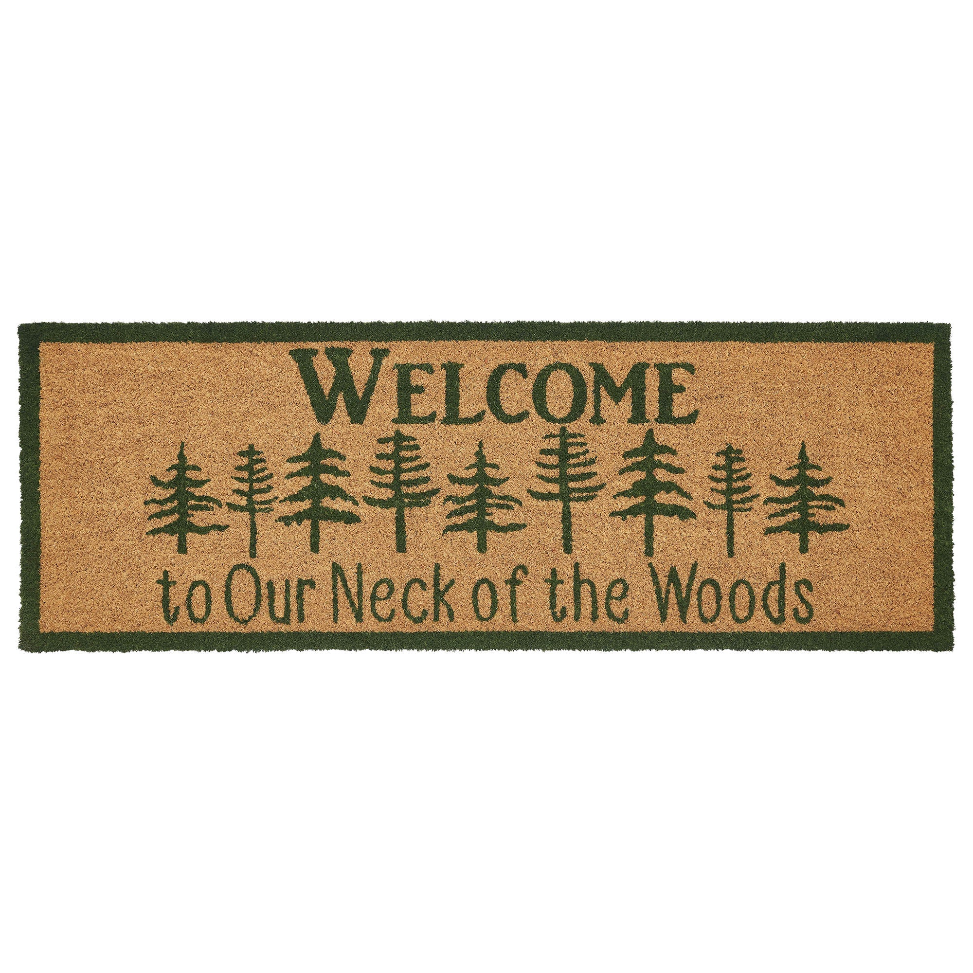 A fun log cabin style doormat featuring the warm greeting "Welcome to Our Neck of the Woods," showcased on a natural tan base. Encircled around silhouettes of trees in rich forest green, it is sure to adds a touch of lodge style to any hall, cabin, lodge or summer house.