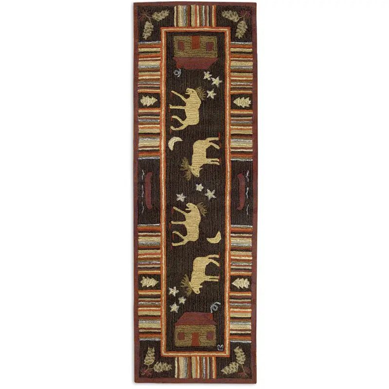 Made from 100% natural wool with a cotton backing, this American log cabin style floor runner features moose and log cabins in warm earth tones accented with pine cones and stars. It was designed by an artist in Vermont and handcrafted by skilled artisans in India. Member of Fair Trade Association.