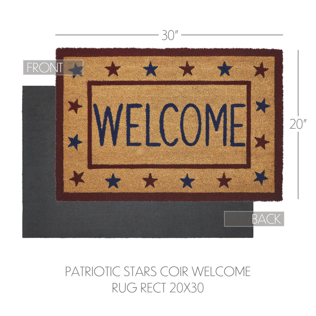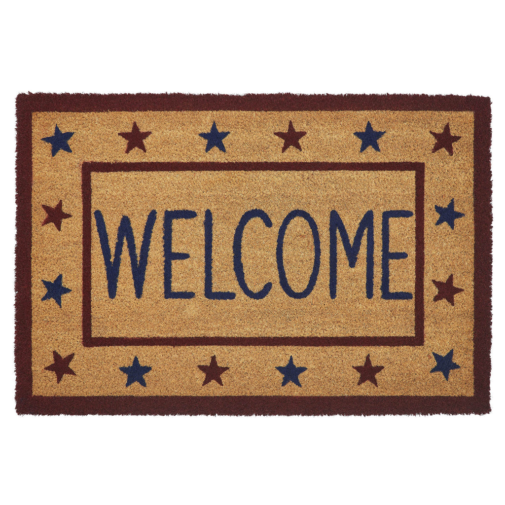 A fun doormat featuring five-point stars in vibrant shades of merlot and country blue, surrounding the warm "Welcome" greeting set against a natural tan base. Accented with a bold red border, this rug embodies Americana style, making it a perfect addition for your entryway.