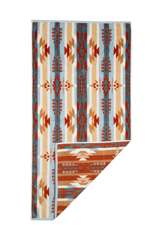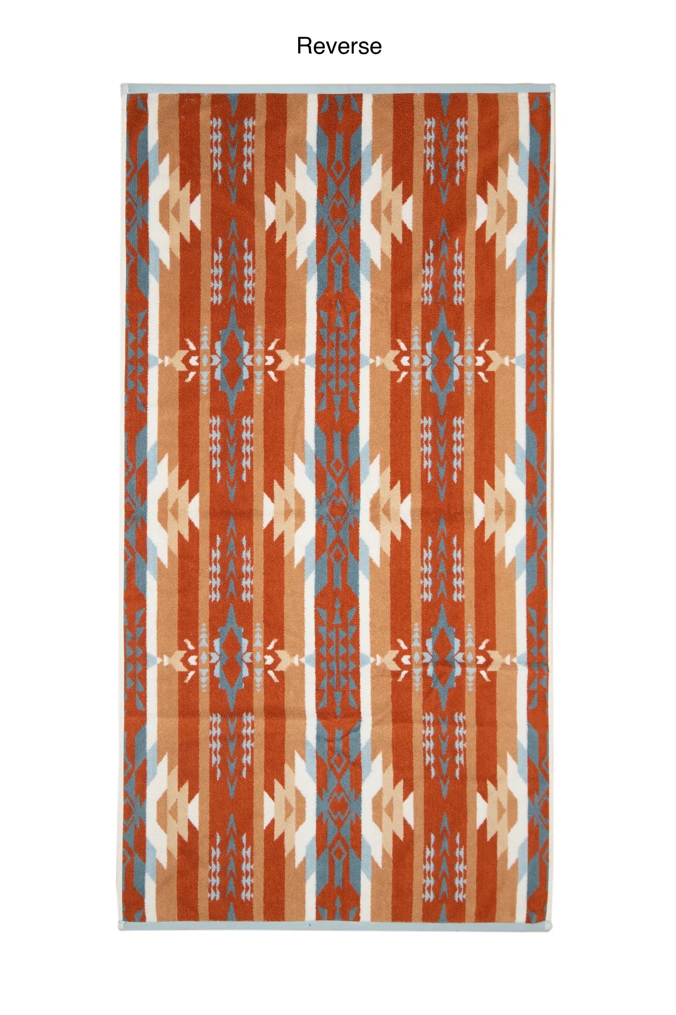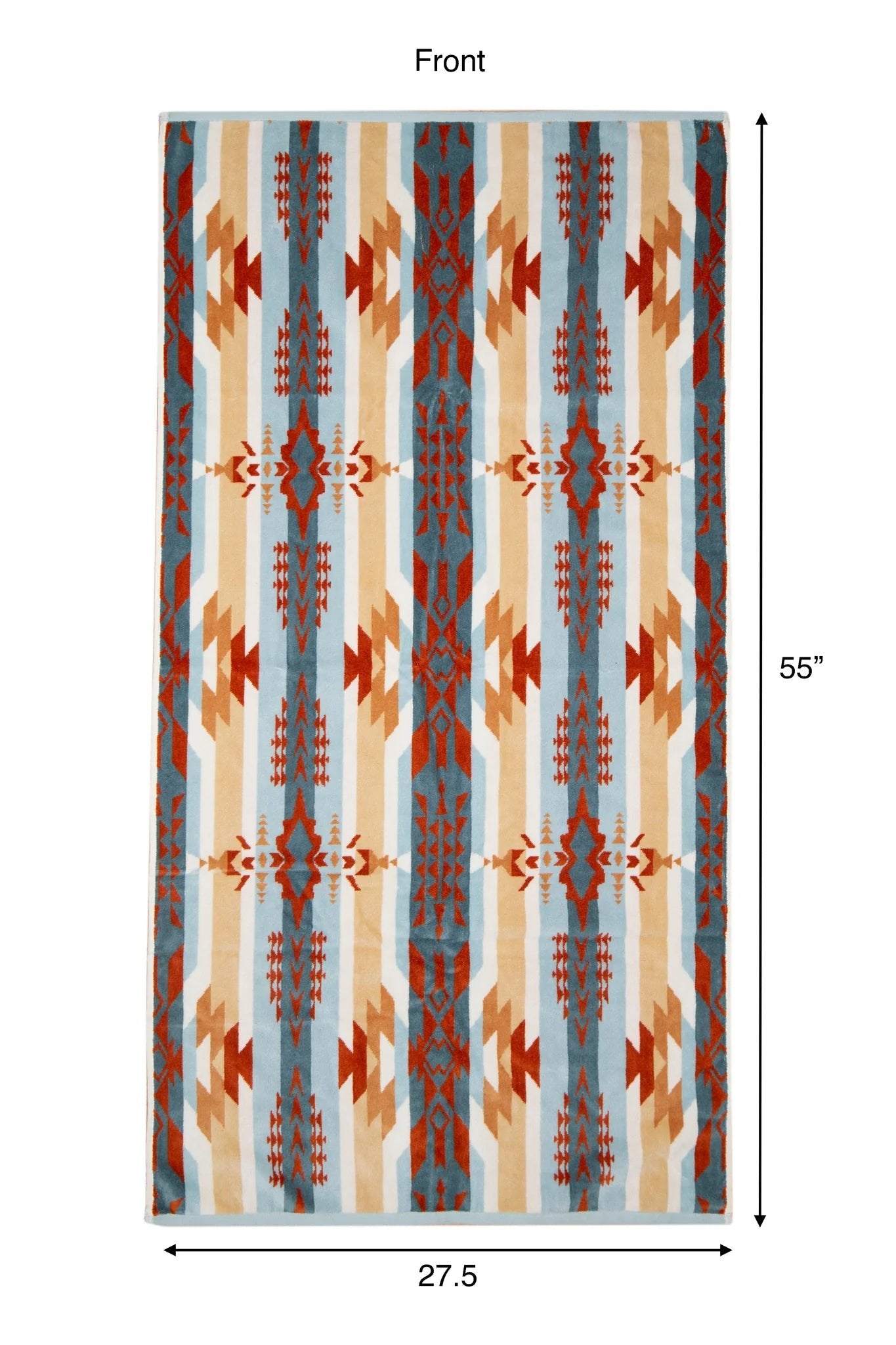 A beautiful Southwestern oversized bath towel in the style of our popular throws. Comes in warm earth tones with teal set on white. Reverse print has a burnt orange background.
