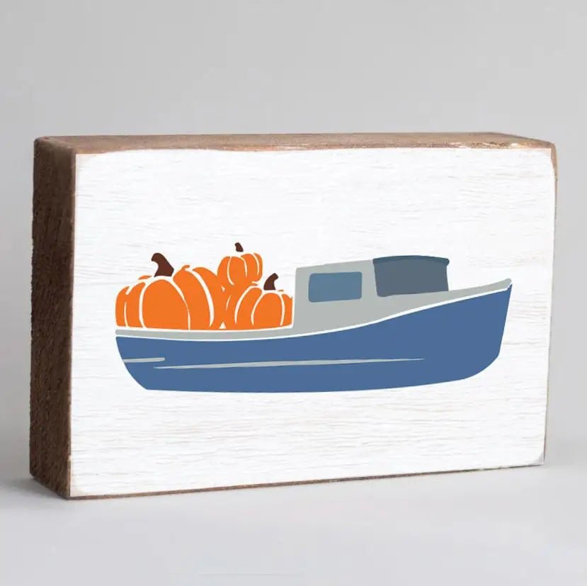 A fun wooden block sign with a blue lobster boat filled to the brim with pumpkins. Makes an eye catching display on a mantel, shelf, bookcase or desk. Handcrafted on the coast in New England. Whitewashed with a rustic finish so that each piece is unique.