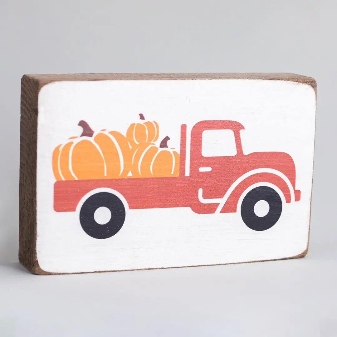 A fun wooden block sign with a vintage red truck filled to the brim with pumpkins. Makes an eye catching display on a mantel, shelf, bookcase or desk. Handcrafted on the coast in New England. Whitewashed with a rustic finish so that each piece is unique.