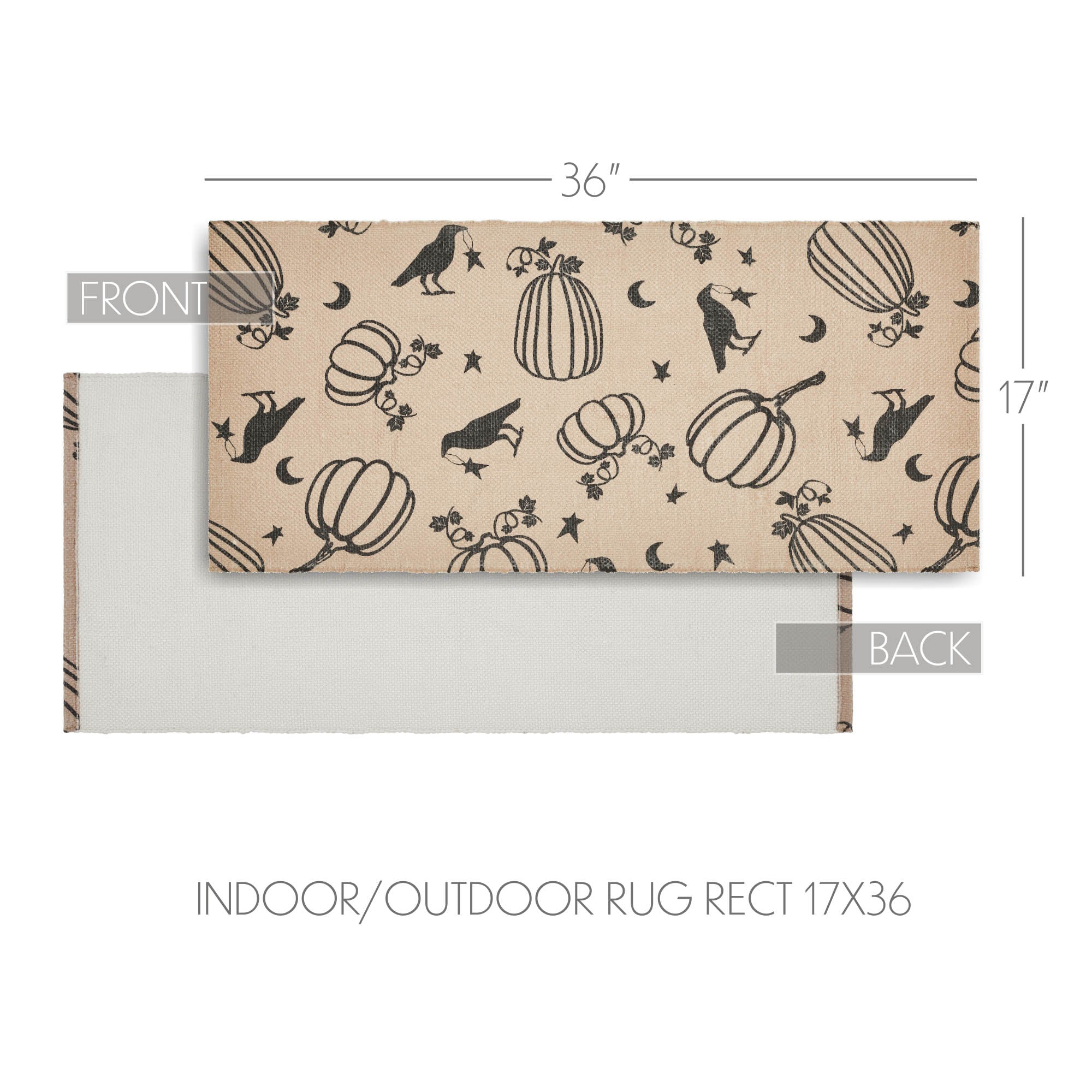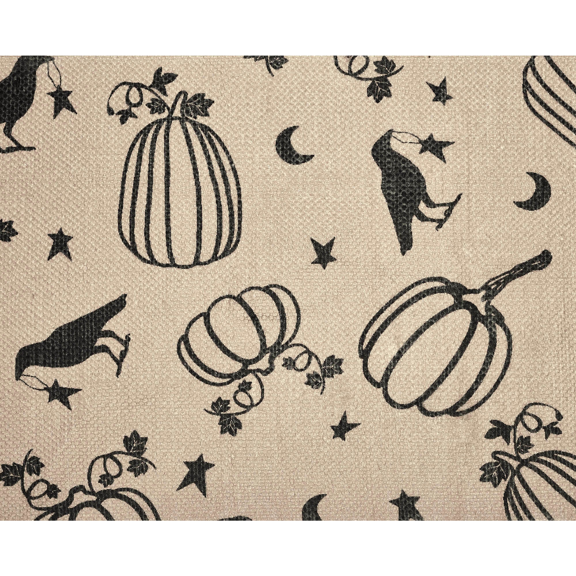 Bathed in a deep tan, the rug's surface comes alive with a black whimsical pumpkins alongside wise ravens perched beneath crescent moons and twinkling stars, crafting a scene straight from a cherished autumn tale. Water-resistant and perfectly sized, this piece seamlessly blends functional design with a heartwarming cottage core aesthetic, transforming any space into a cosy haven ready for the season's gatherings.