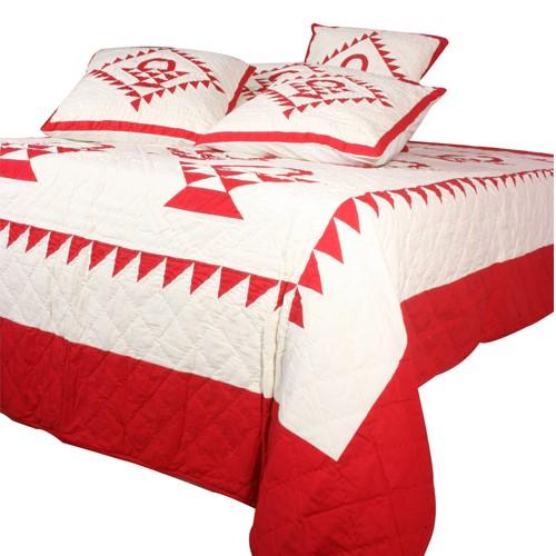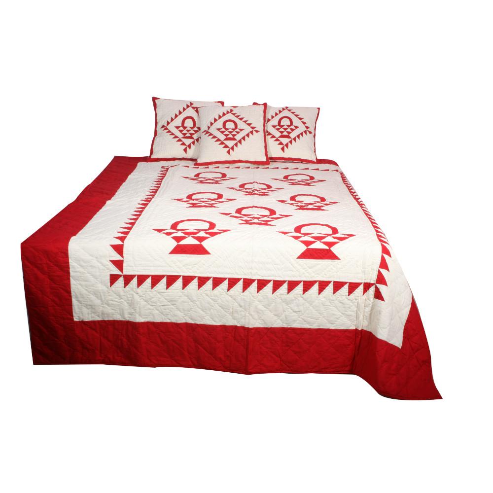 A wonderful reproduction of an early American quilt featuring a red country basket pattern on an ecru background with beautiful hand-stitching in 100% cotton. It was made by Indian women weavers in their family homes, using power-looms, and is hand-quilted to perfection. A warm and cosy quilt with extremely soft, breathable natural cotton casing with surgical-grade bleached cotton filling.