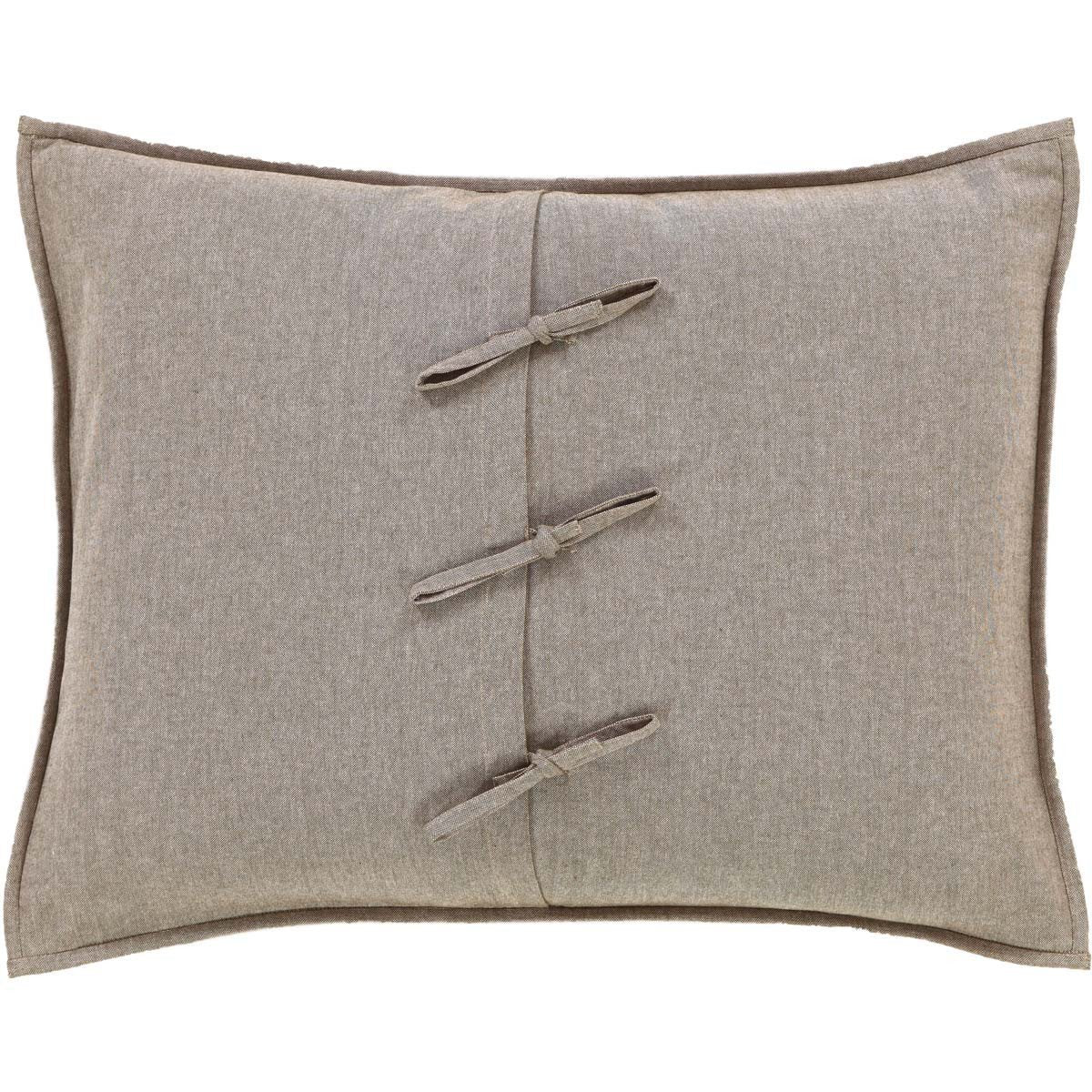 Neutral brown tones create a calming and restful respite with this sham featuring an irregular block layout. The various greige, chocolate brown, and tan plaids with occasional patchwork in antique stripes provide a distinct, relaxed look for this all cotton hand-quilted sham. The reverse side showcases textured greige chambray fabric with three ties for closure. Matching Quilt sold separately.