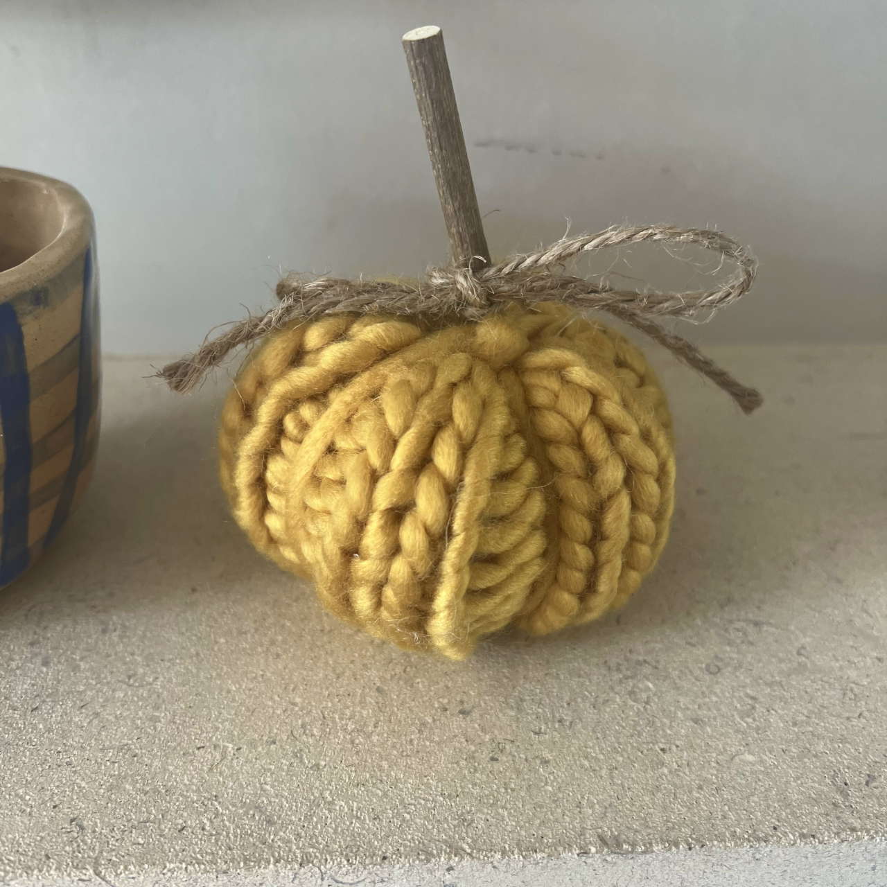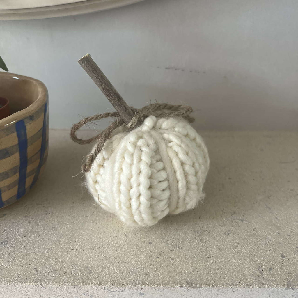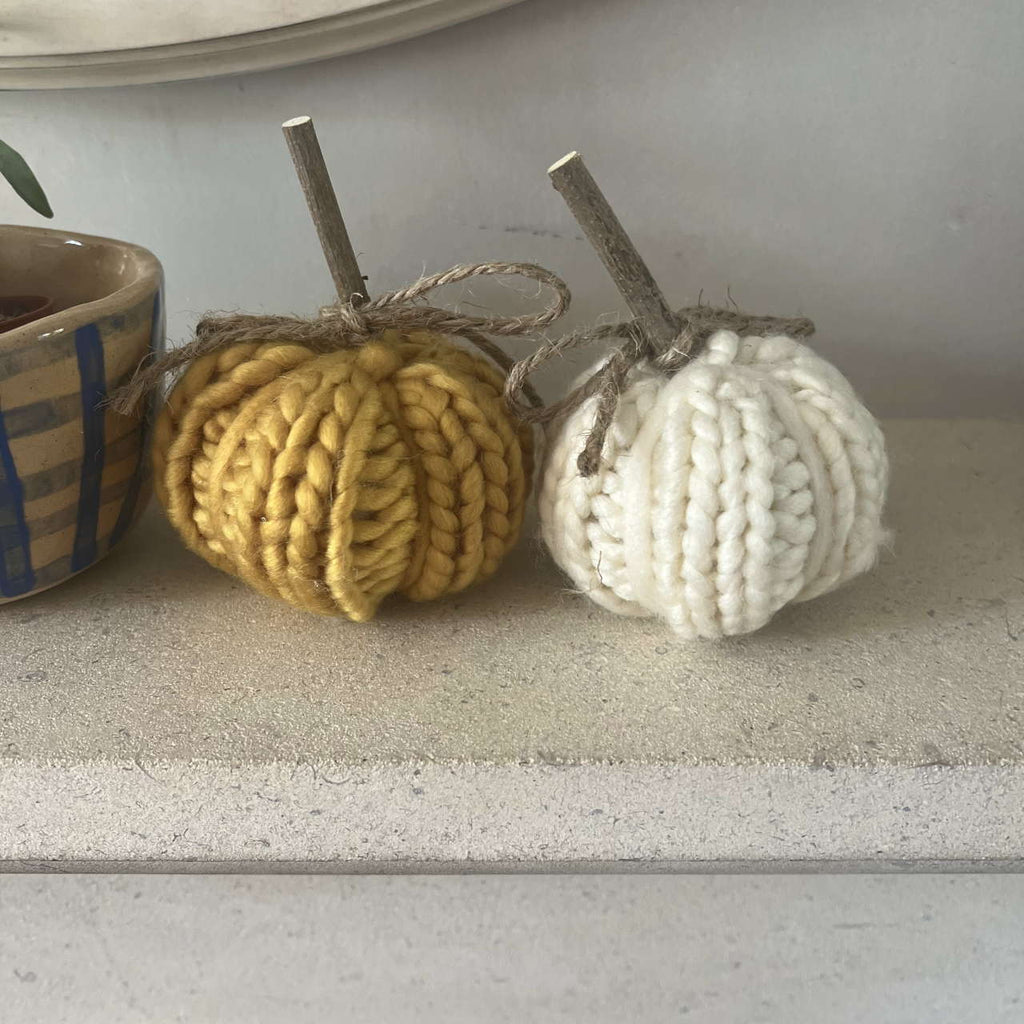 A set of 2 beautiful little knitted pumpkins in cream and mustard knitted fabric. Make a beautiful fall display by mixing with our bigger pumpkins and decorations.