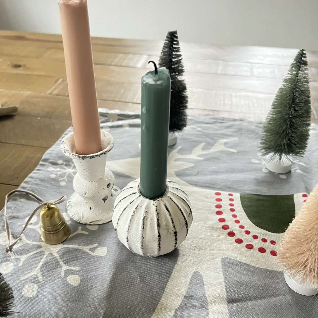 A spherical metal candle holder, made to hold a taper candle. The holder features distressed white paint and a raised line texture. This holder works well with everyday décor with its neutral colours and looks beautiful displayed on a mantle, bookshelf, or other flat surface, paired with garlands or other tapers and holders.