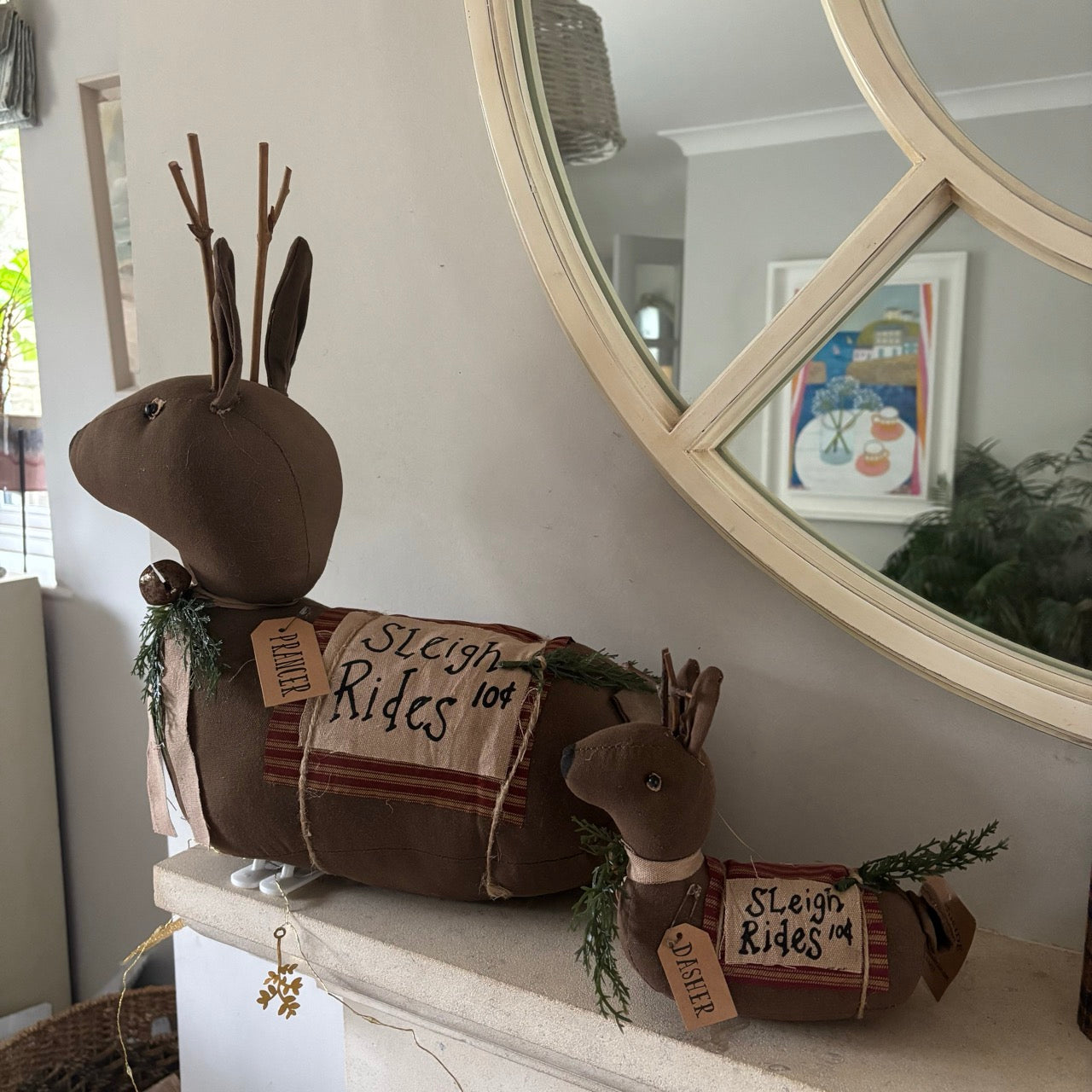 This primitive, stuffed fabric reindeer has a a unique sitting design and includes stick antlers for rustic charm. He wears a blanket that reads, "Sleigh Rides 10¢" and a vintage-style paper name tag that reads, "Dasher." Faux cedar greenery and a tarnished jingle bell add to the Winter woodland look. While it can be displayed freestanding, it also includes a fine string for the option of hanging as an ornament.