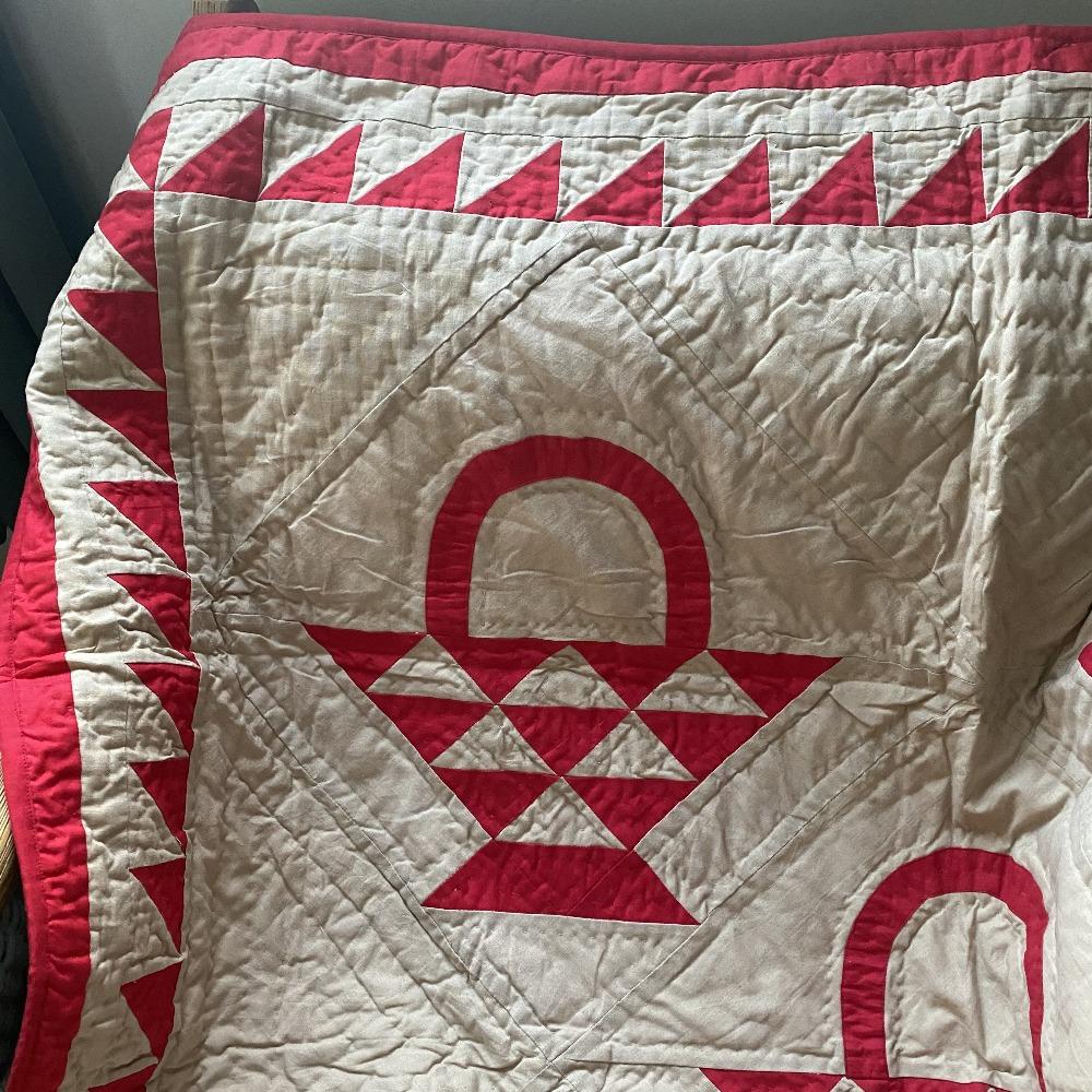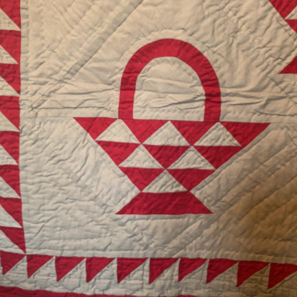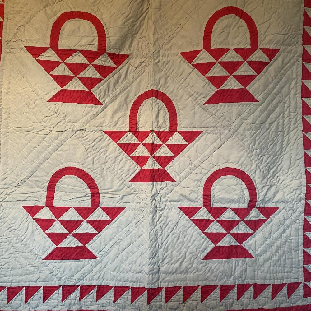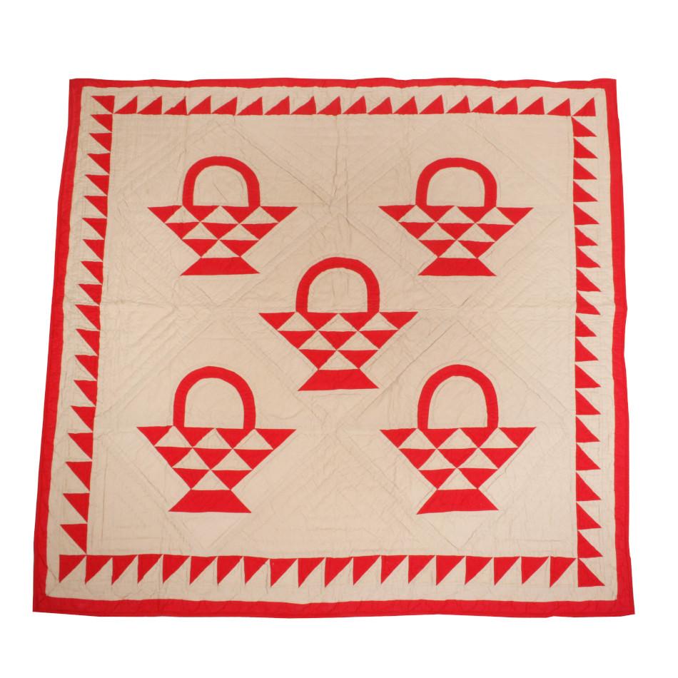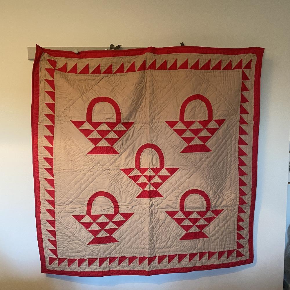 A classic throw sized reproduction of an early American quilt featuring a red country basket pattern on a tan tea dyed background with beautiful hand-stitching in 100% cotton. Looks great thrown on the back of a chair and can also be used as a New England style wall hanging.