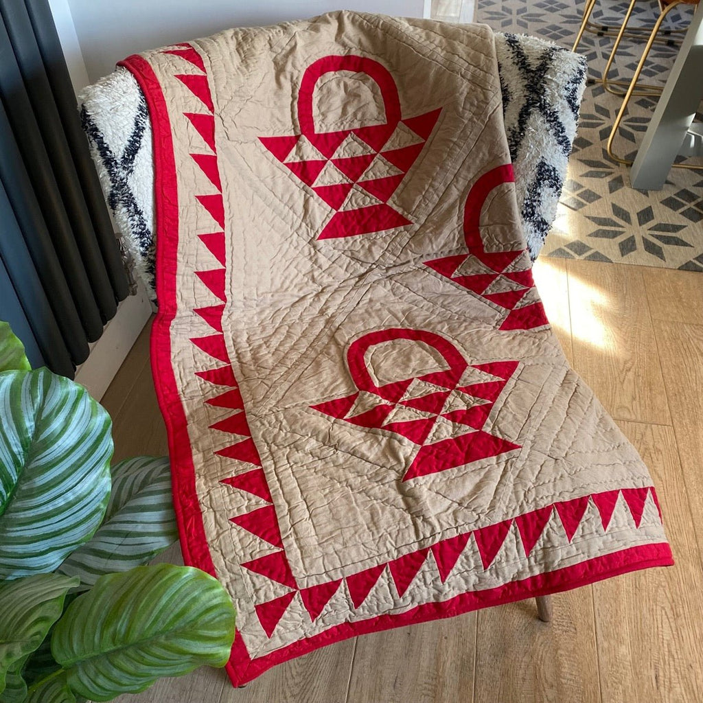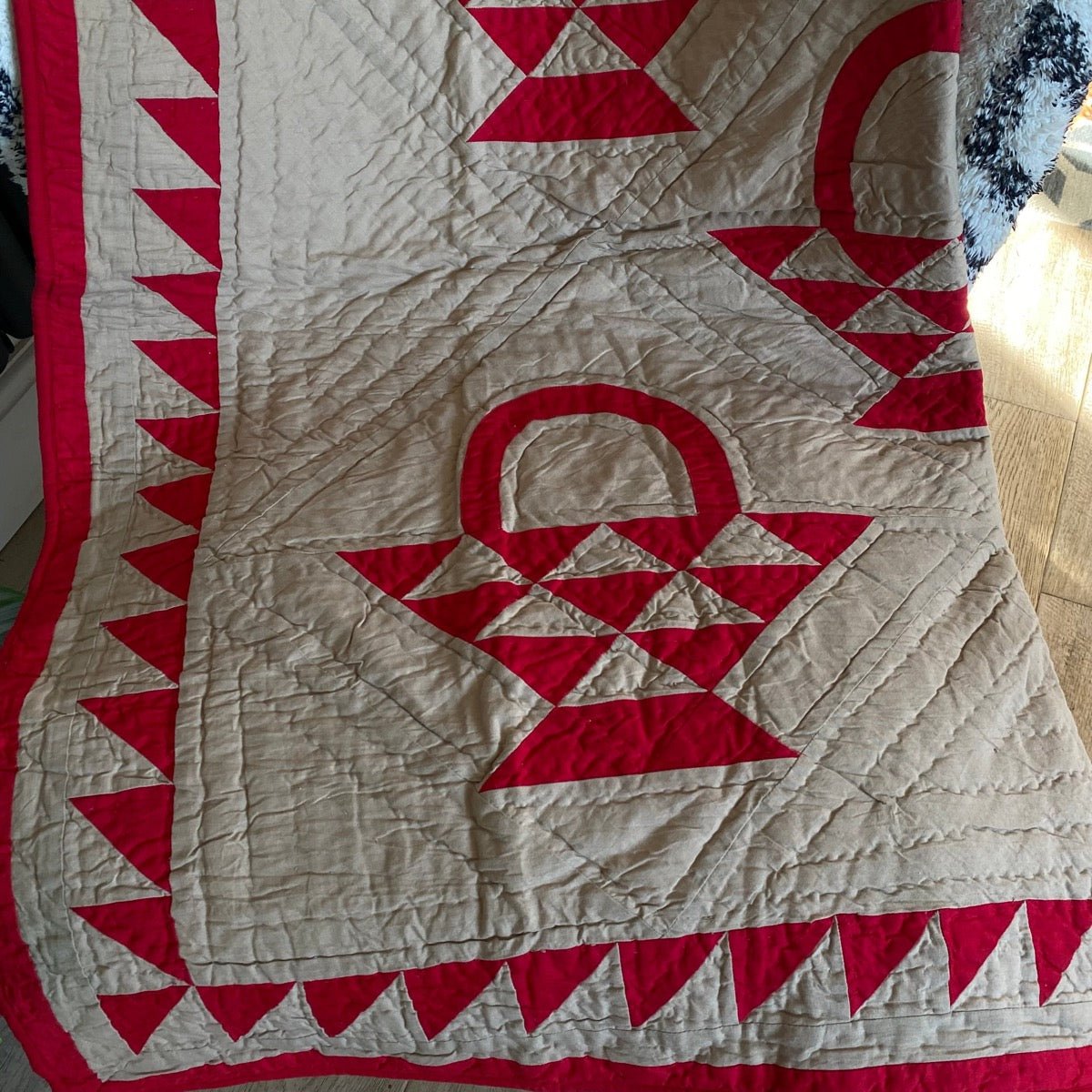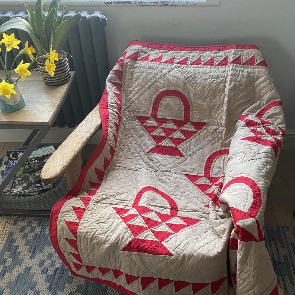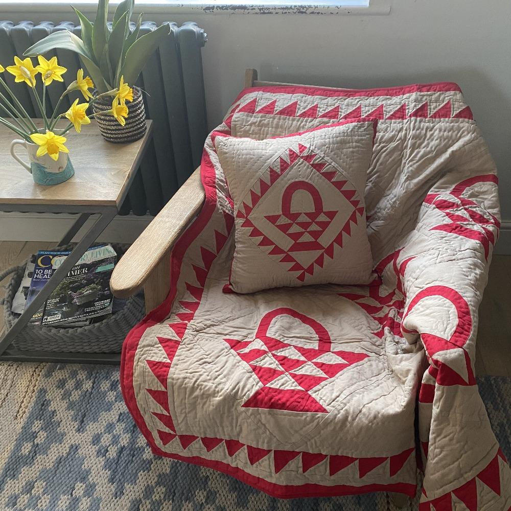 A classic throw sized reproduction of an early American quilt featuring a red country basket pattern on a tan tea dyed background with beautiful hand-stitching in 100% cotton. Looks great thrown on the back of a chair and can also be used as a New England style wall hanging.