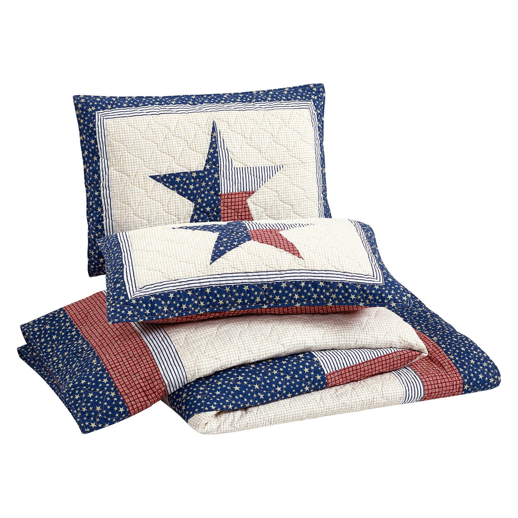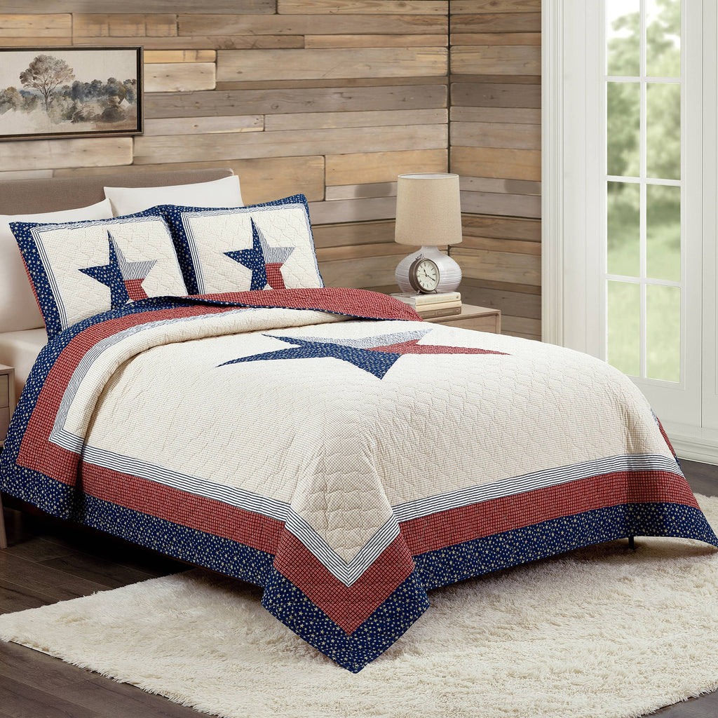 Add a dash of Texas flair to your bedroom with the Texas Lone Star Quilt Set. Crafted from 100% cotton fabric and fill, this lightweight bedding set delivers breathable comfort, ideal for all seasons. Use on its own over a top sheet in summer and warmer months or over a duvet in winter in cold rooms. Set includes a quilt and 2 matching pillowcase shams.