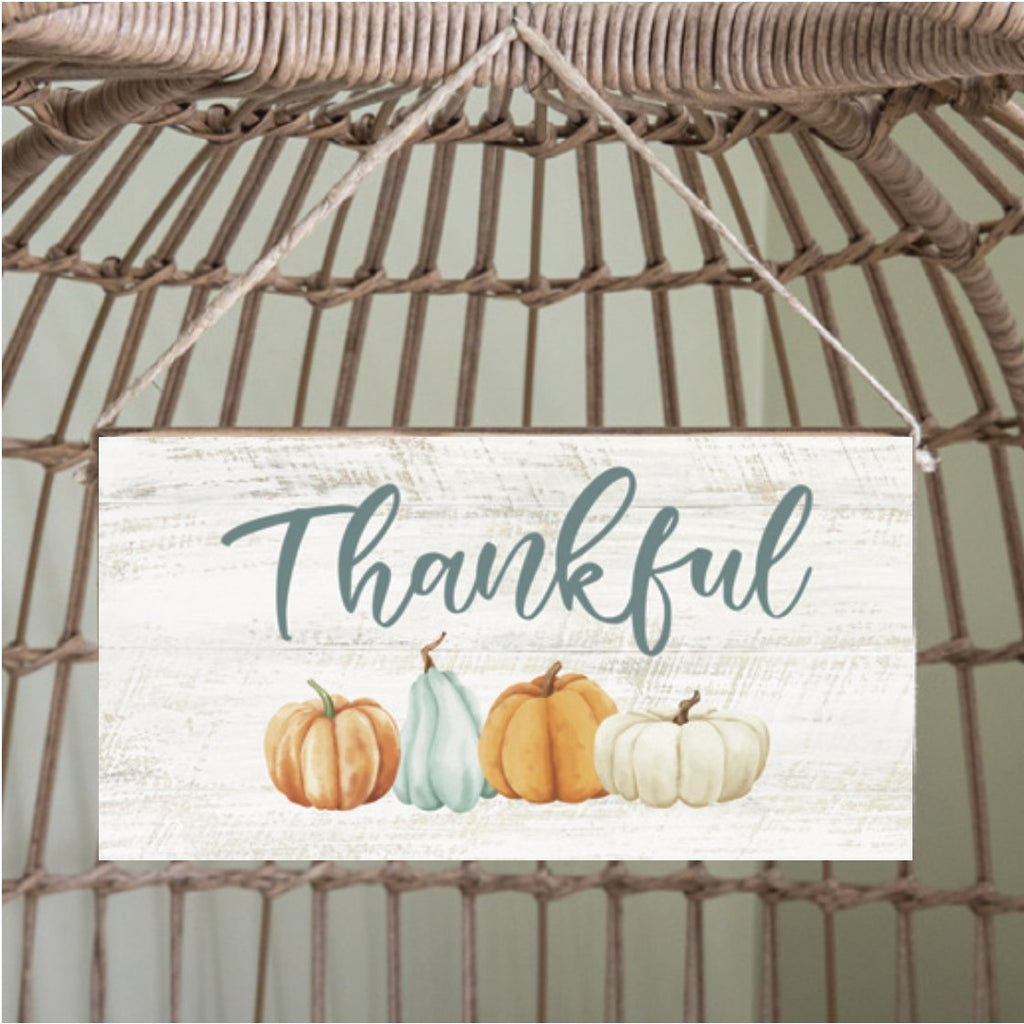 Crafted of solid wood, this distressed whitewashed wooden sign has a row of pumpkins and the message 'Thankful'. It is easy to hang anywhere. Handcrafted from solid rustic pine by the coast in New England. Each sign has various rustic characteristics which is to add charm and make it unique.