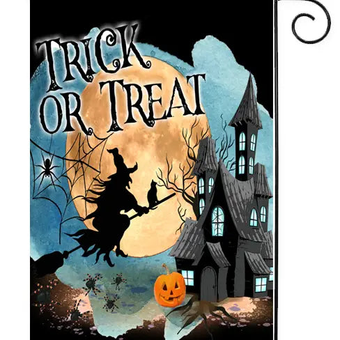 Welcome visitors and trick or treaters with this fun garden flag featuring a haunted house and witch on a broomstick. Flag is made from 2 panels of heavy duty soft polyester with an exclusive sun block backing to enhance the rich vibrant colours of the design. The 2-ply design is the weather, mould, mildew, and UV-fade resistant. Most importantly, it's just heavy enough for a picture perfect drape and graceful movement. Double stitched not only is the outside perimeter and each corner neatly double stitched, but the ends of the sewn-in rod pocket at the top of the flag are also as well so they will withstand the test of time.