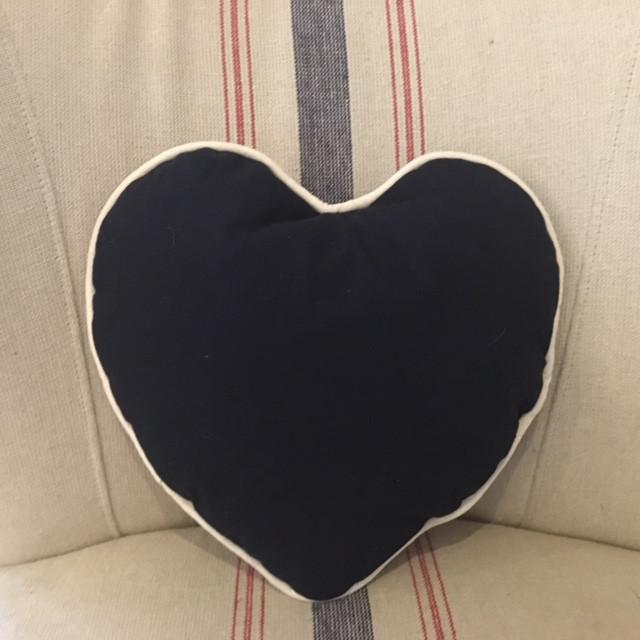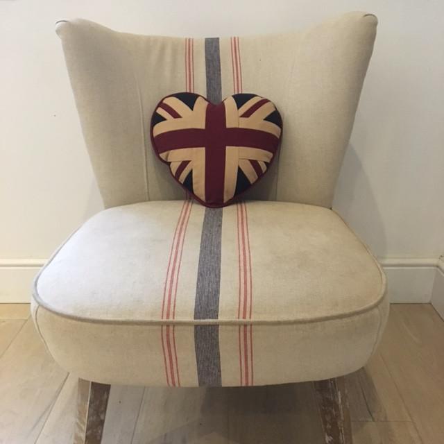 Vintage style Union Jack cushion in the shape of a heart. Colours are a deep navy, burgundy and tan. Burgundy piping with navy blue fabric on the reverse.