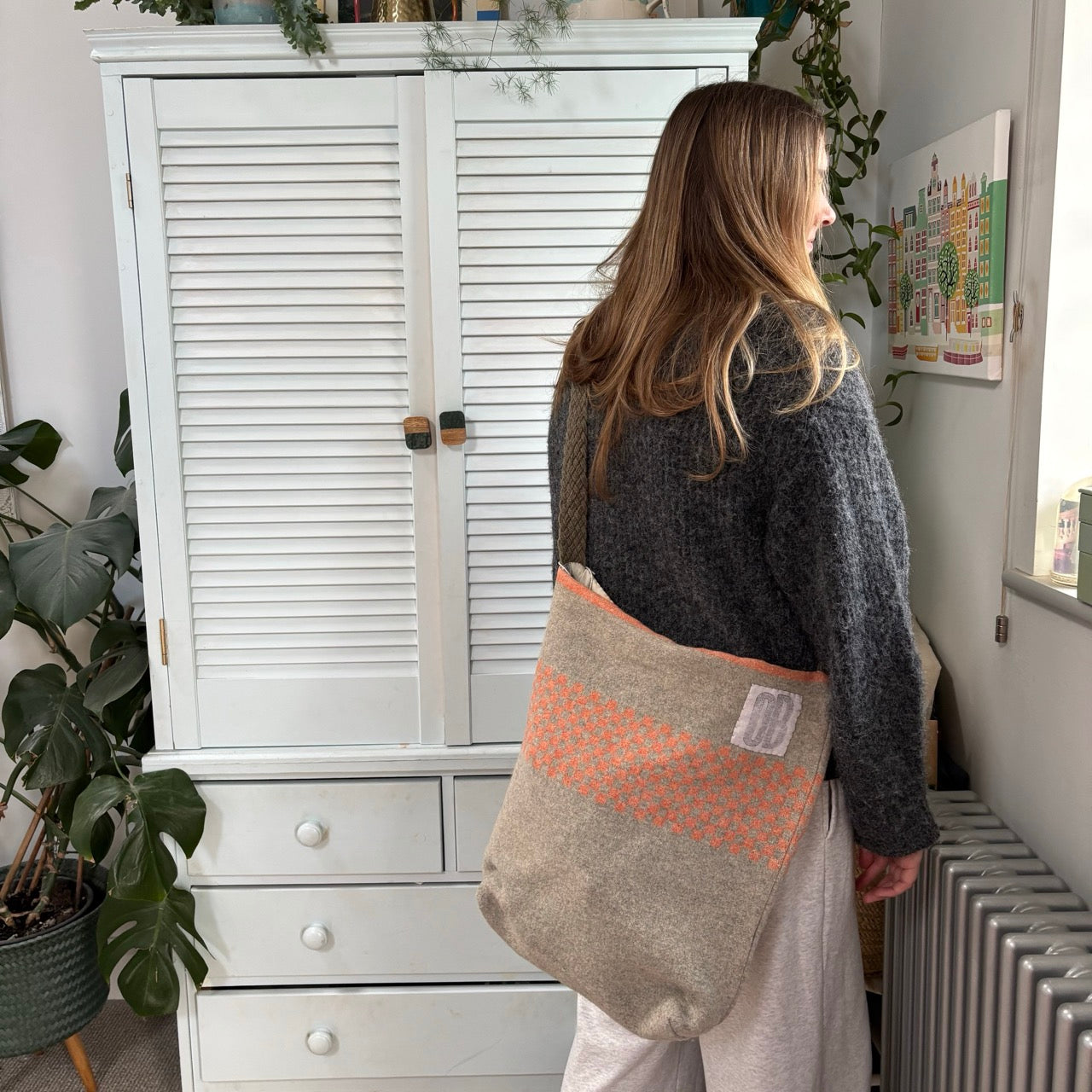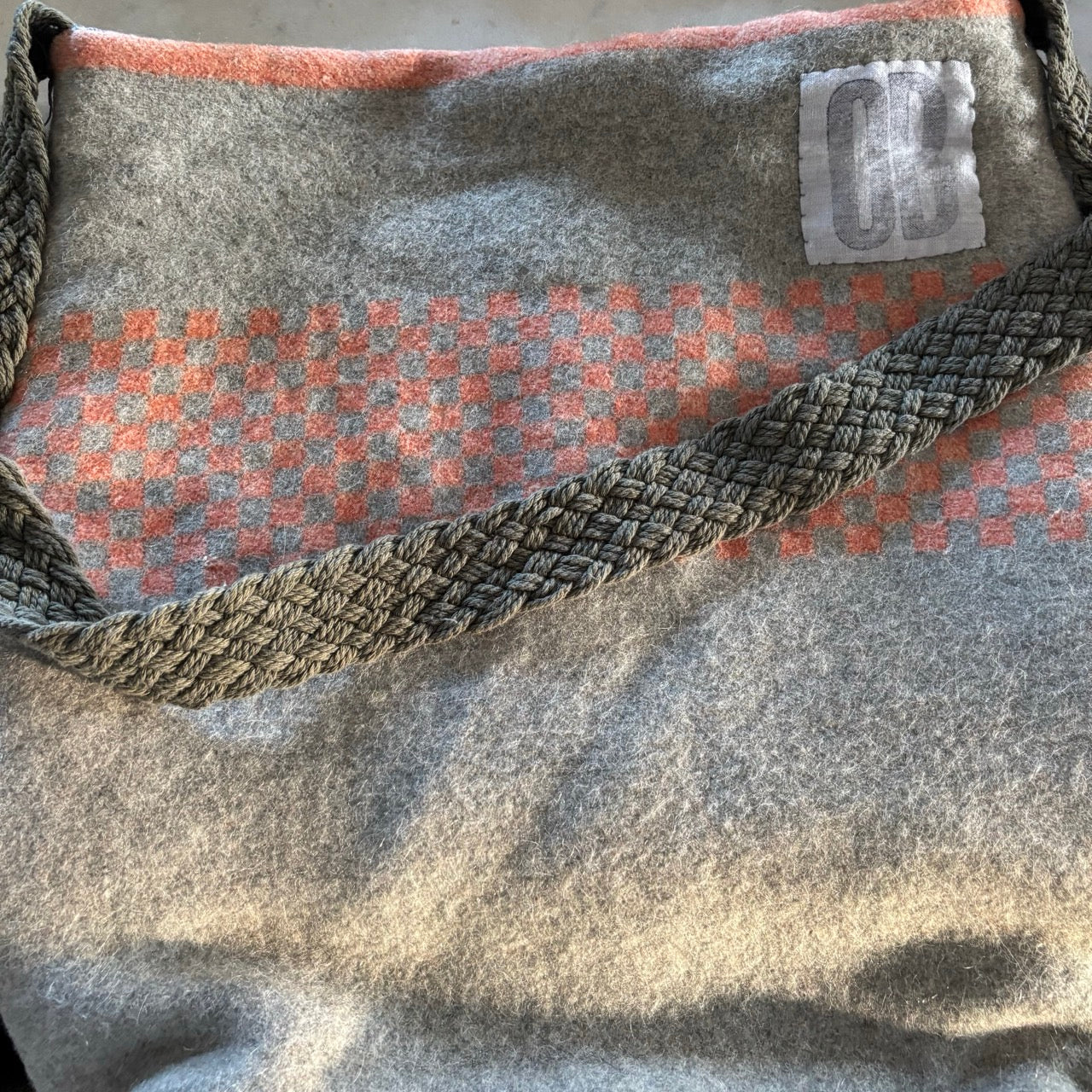 Another great find from a market in Maine, this one off bag is handmade from a vintage American wool blanket and then lined with an old check shirt on the inside, complete with a pocket. Finished with a braided khaki strap.