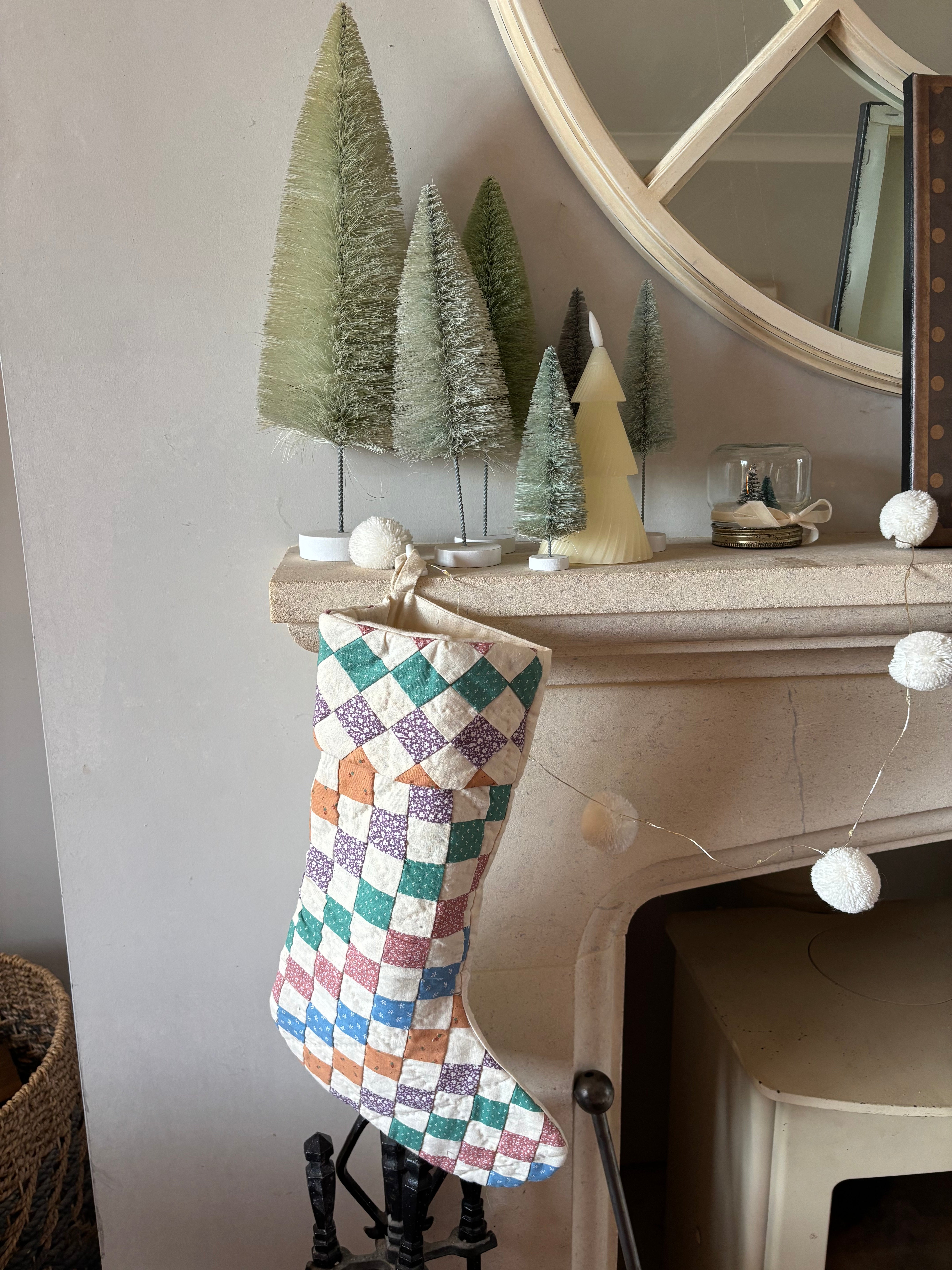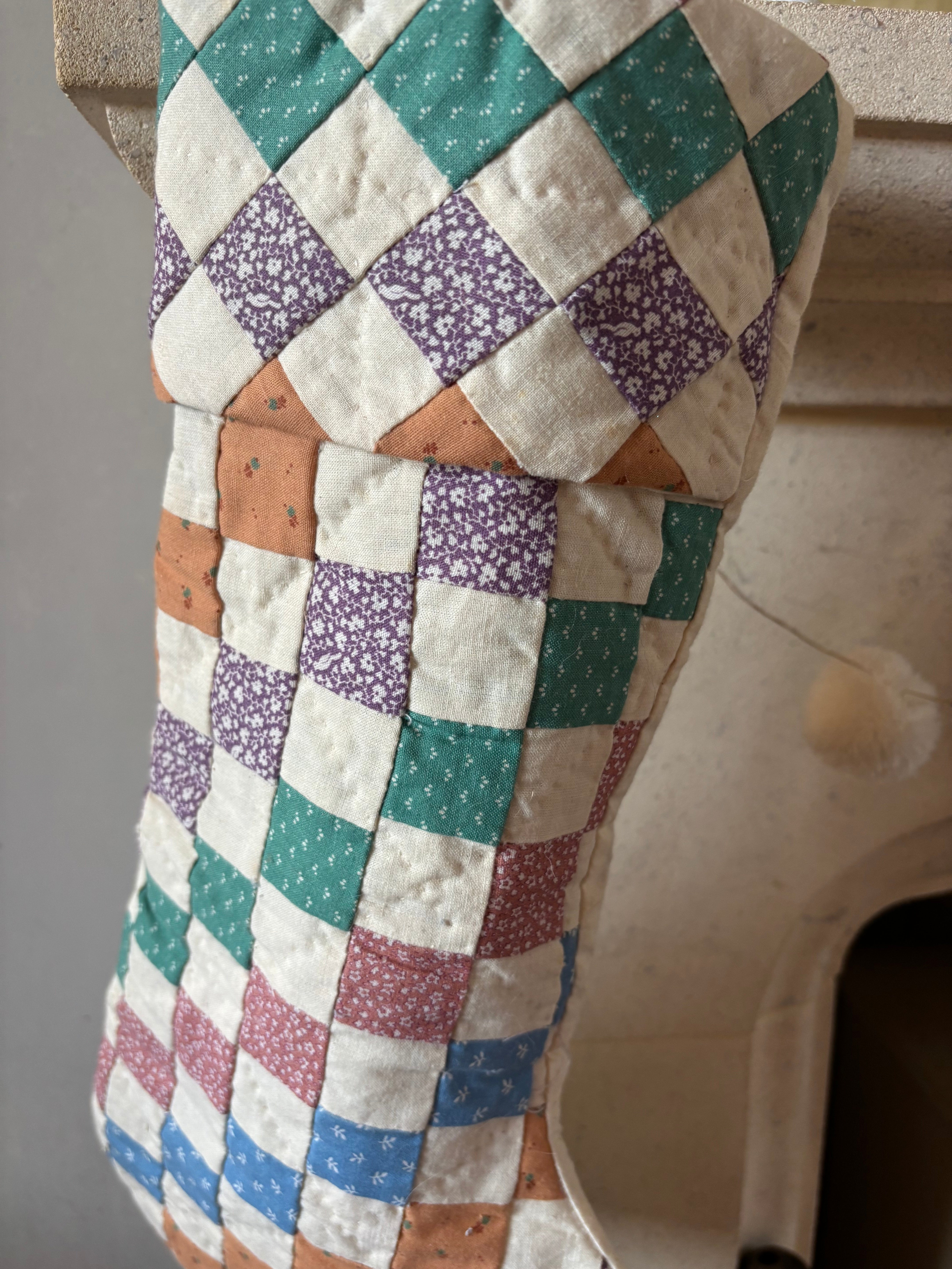 I found this one off stocking at a farmer's market in Maine from a lovely lady who repurposes vintage linens and blankets. This is made from an antique American quilt with teal, mauve, blue and beige on an antique white background. Would make a lovely gift for anyone who loves quilts.