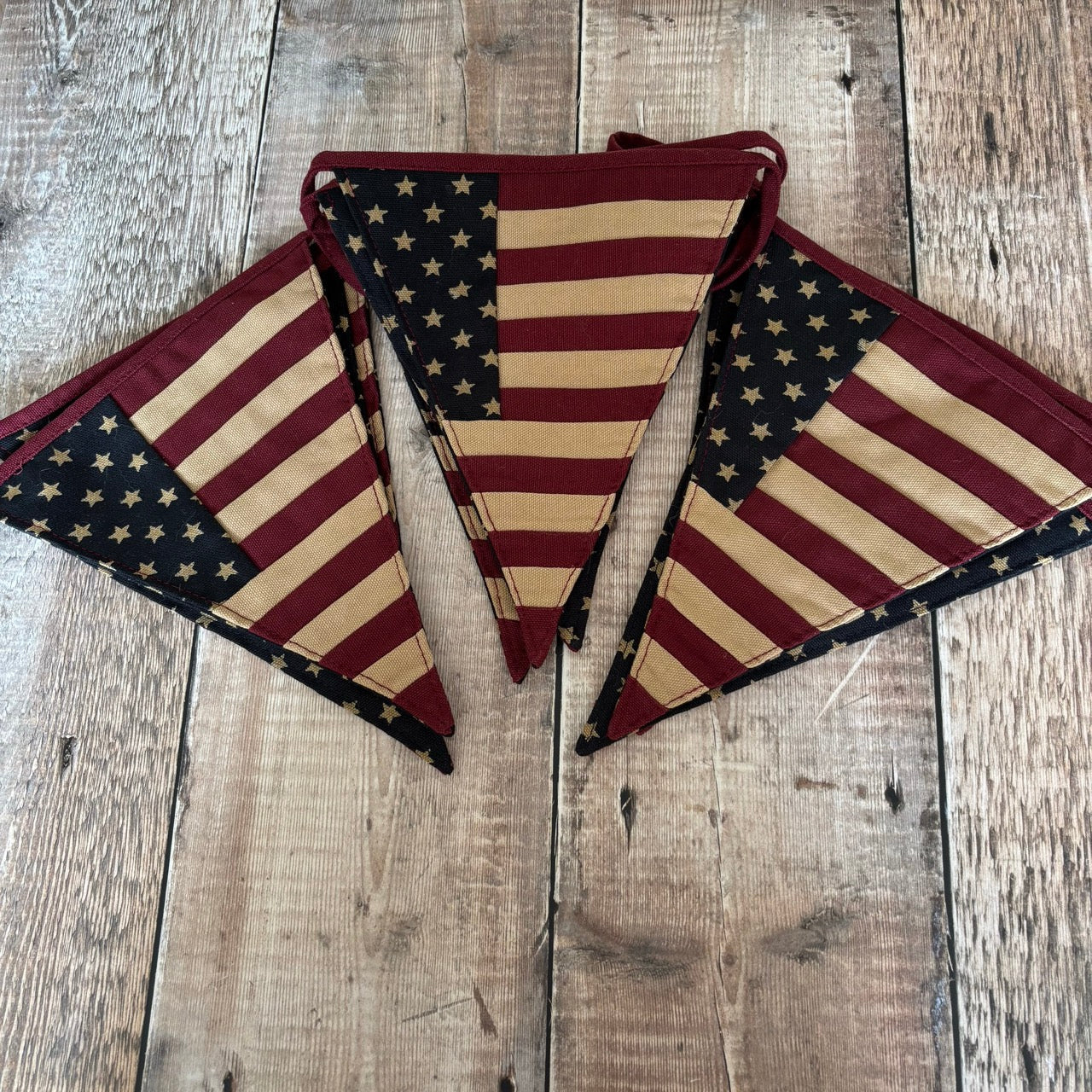 Our vintage glory bunting features a retro stars and stripes flag esign in dark navy, burgundy and tan. Made from heavyweight sturdy 100% cotton. Flags have the opposite navy with small stars fabric on the reverse.