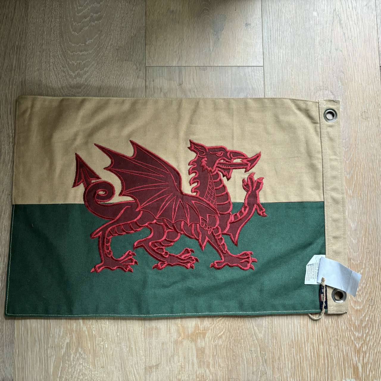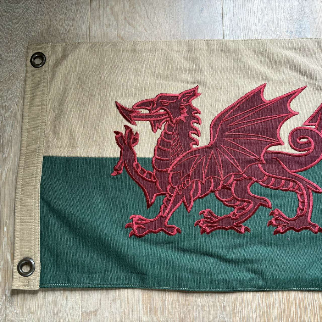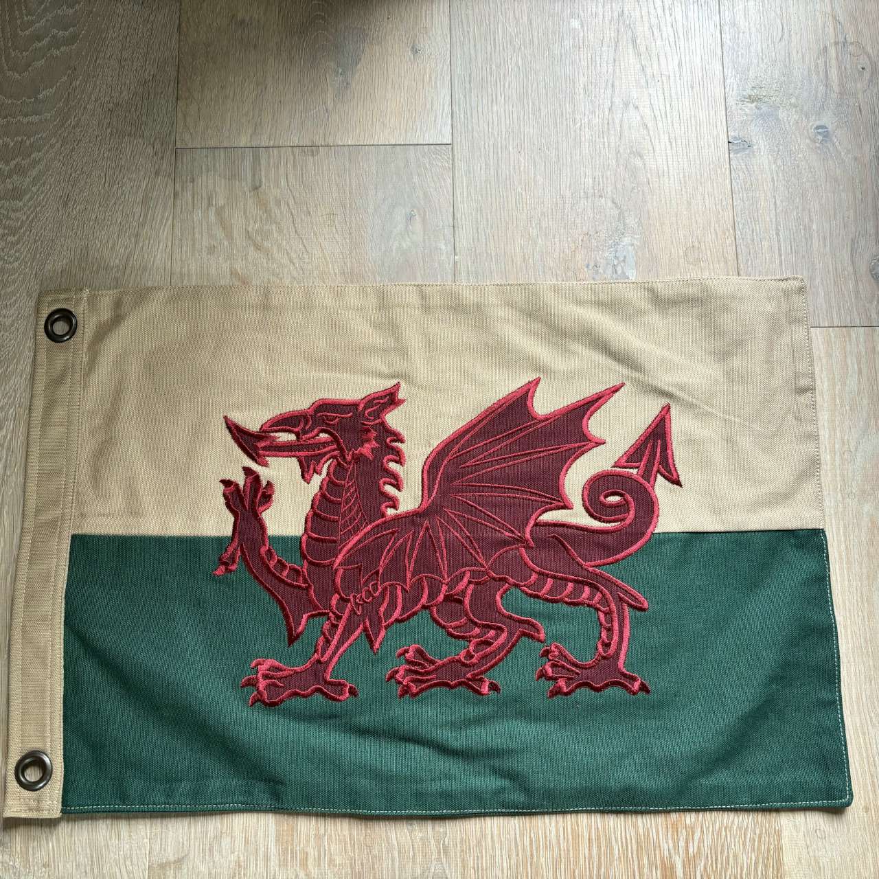A single layered cotton Welsh dragon flag with in deep green, dark red and tea dyed tan cotton fabric.