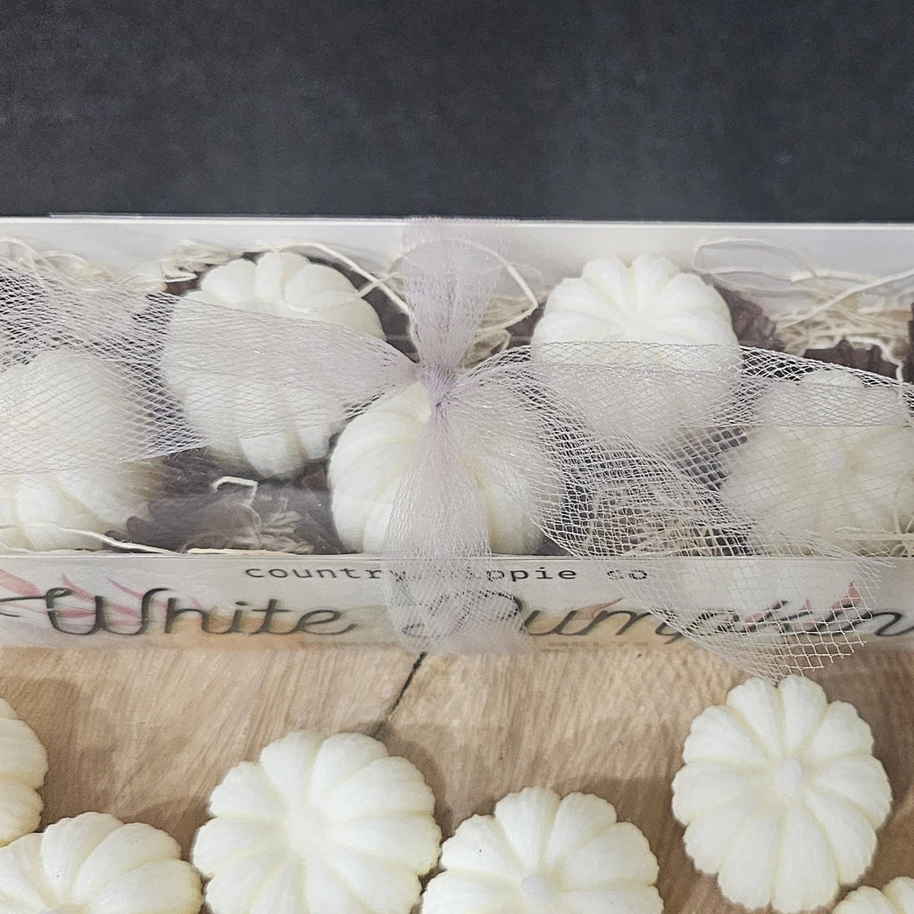 This ready-to-go gift box contains 9 pumpkins all scented with our fabulous White Pumpkin + Amber scent. A Best Seller!