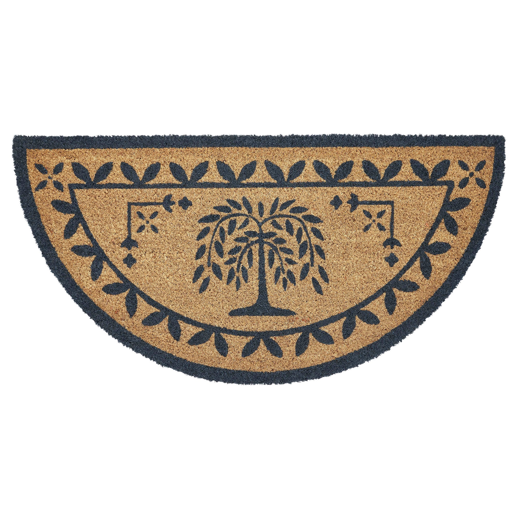 This charming doormat features a vintage willow tree silhouette, framed by a mosaic and leaf border in dark grey, all set against a natural tan coir background. The half-circle shape adds a unique, decorative touch to your entryway, making it an ideal addition to any farmhouse or country-style home.
