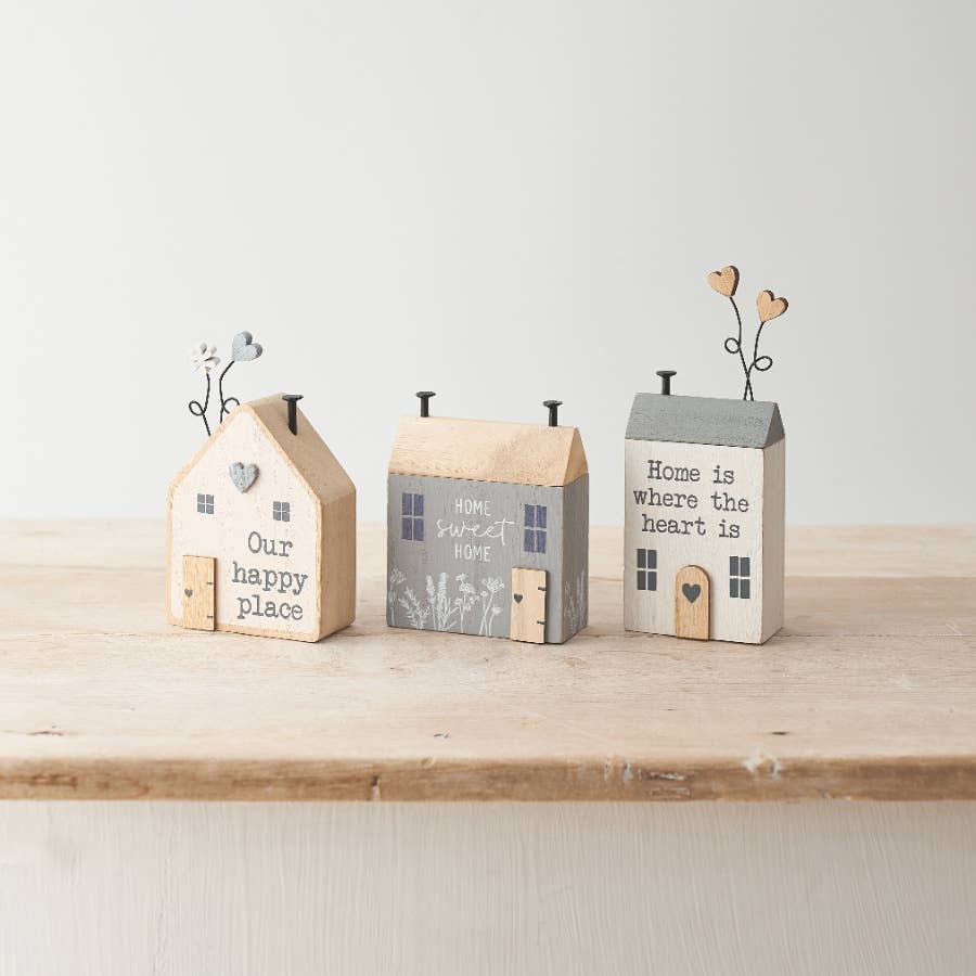 A cute little wooden house decoration with a stylish grey colour scheme and "home sweet home" message. Finished with floral detailing along the bottom.